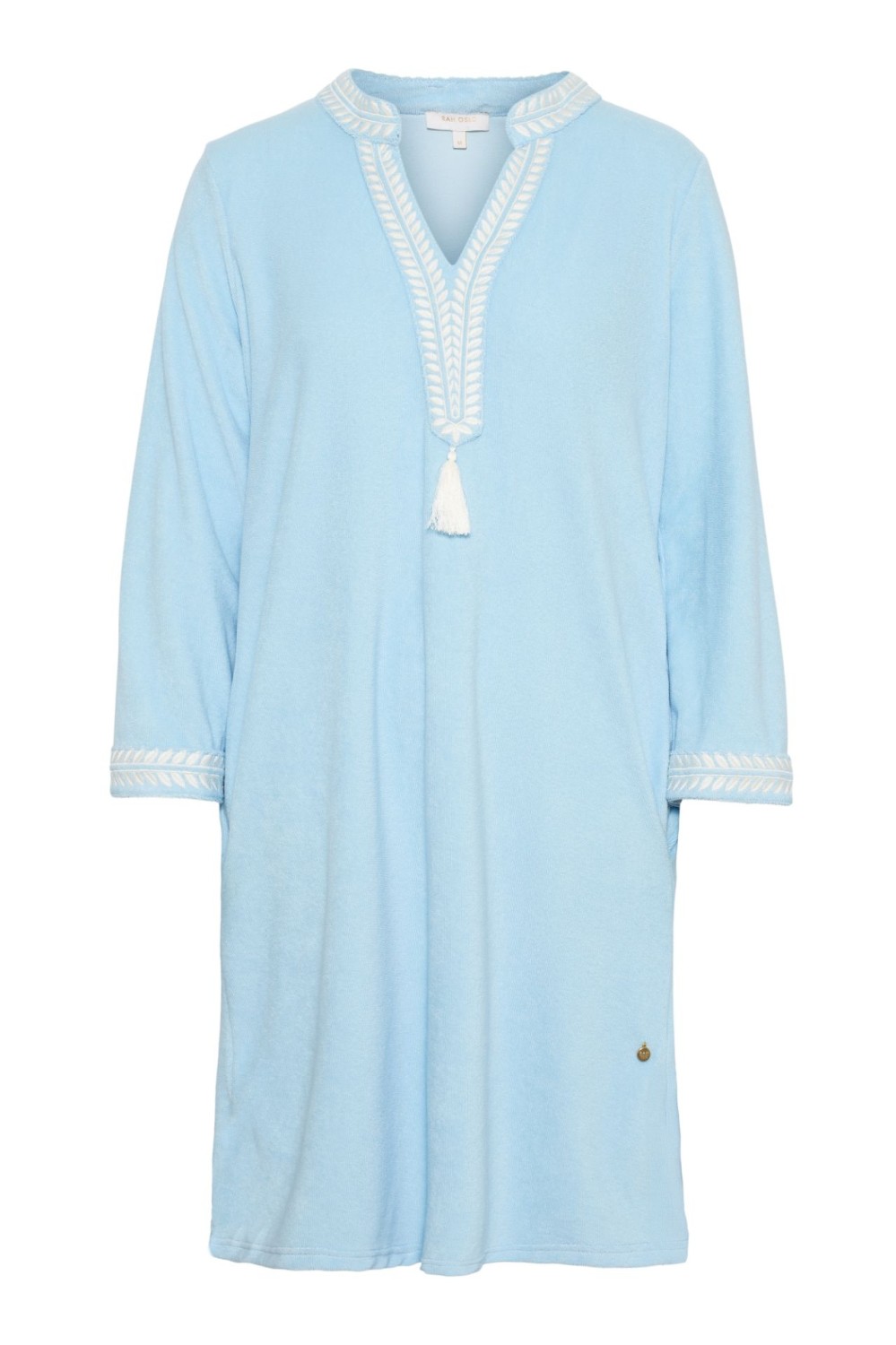 Kjolen har en rett og avslappet fasong, V-hals med dekorative broderinger og matchende broderte detaljer nederst på ermene.