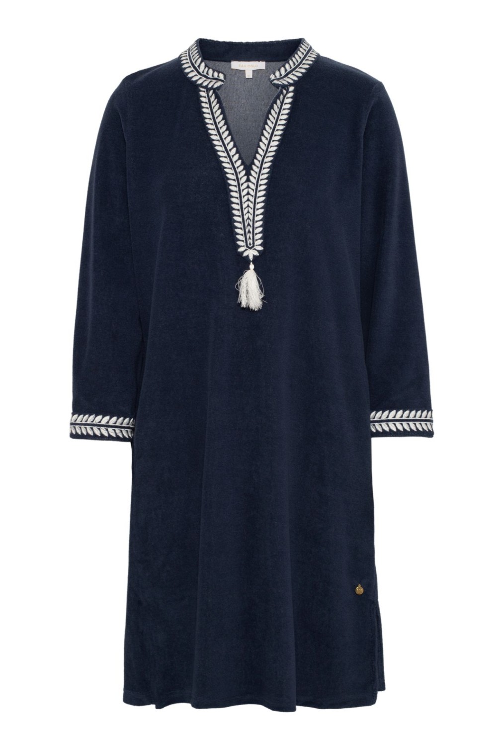Kjolen har en rett og avslappet fasong, V-hals med dekorative broderinger og matchende broderte detaljer nederst på ermene.