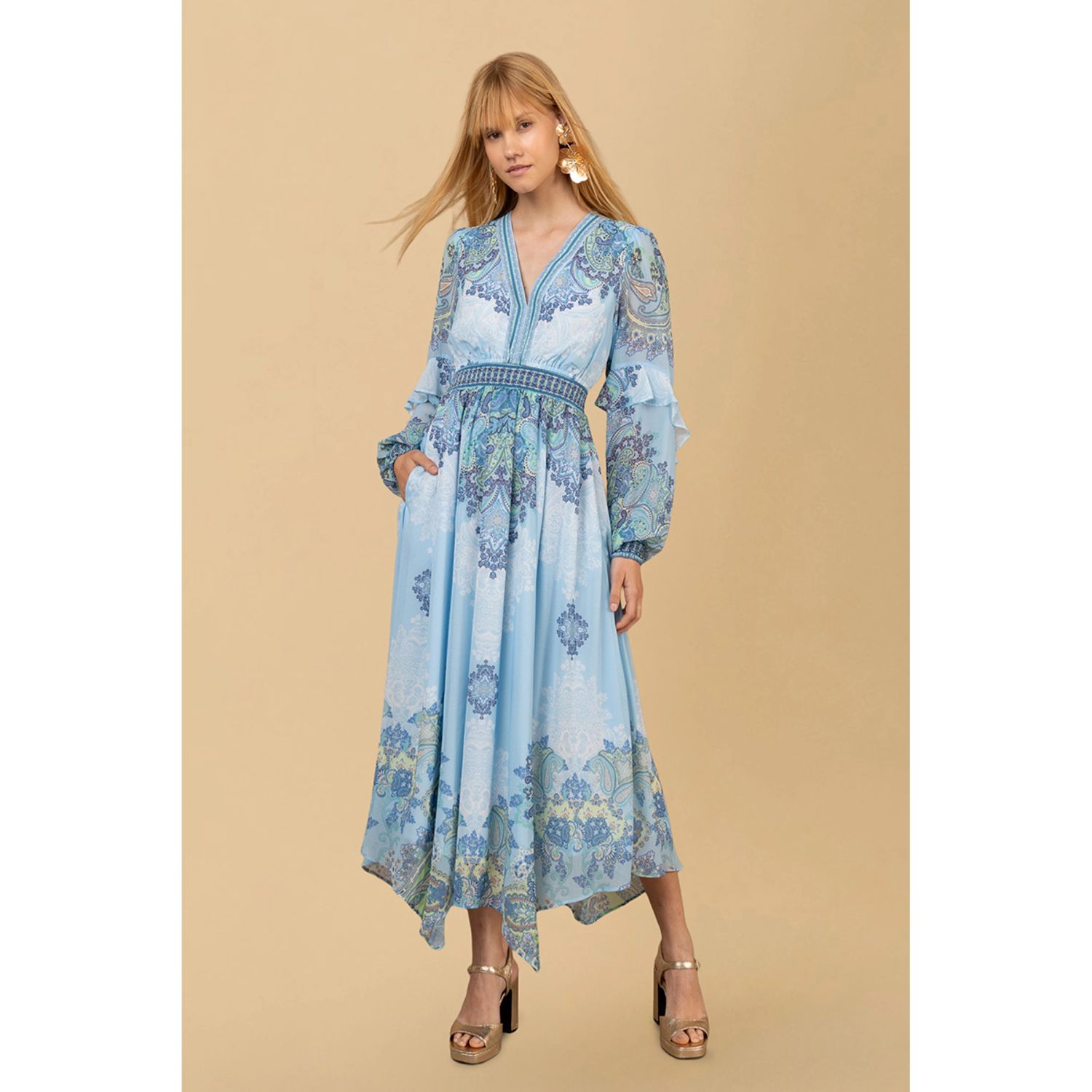 Nydelig kjole med lange volumiøse ermer og V-hals. Kjolen har et nydelig mønster, sidelommer og markert midje.