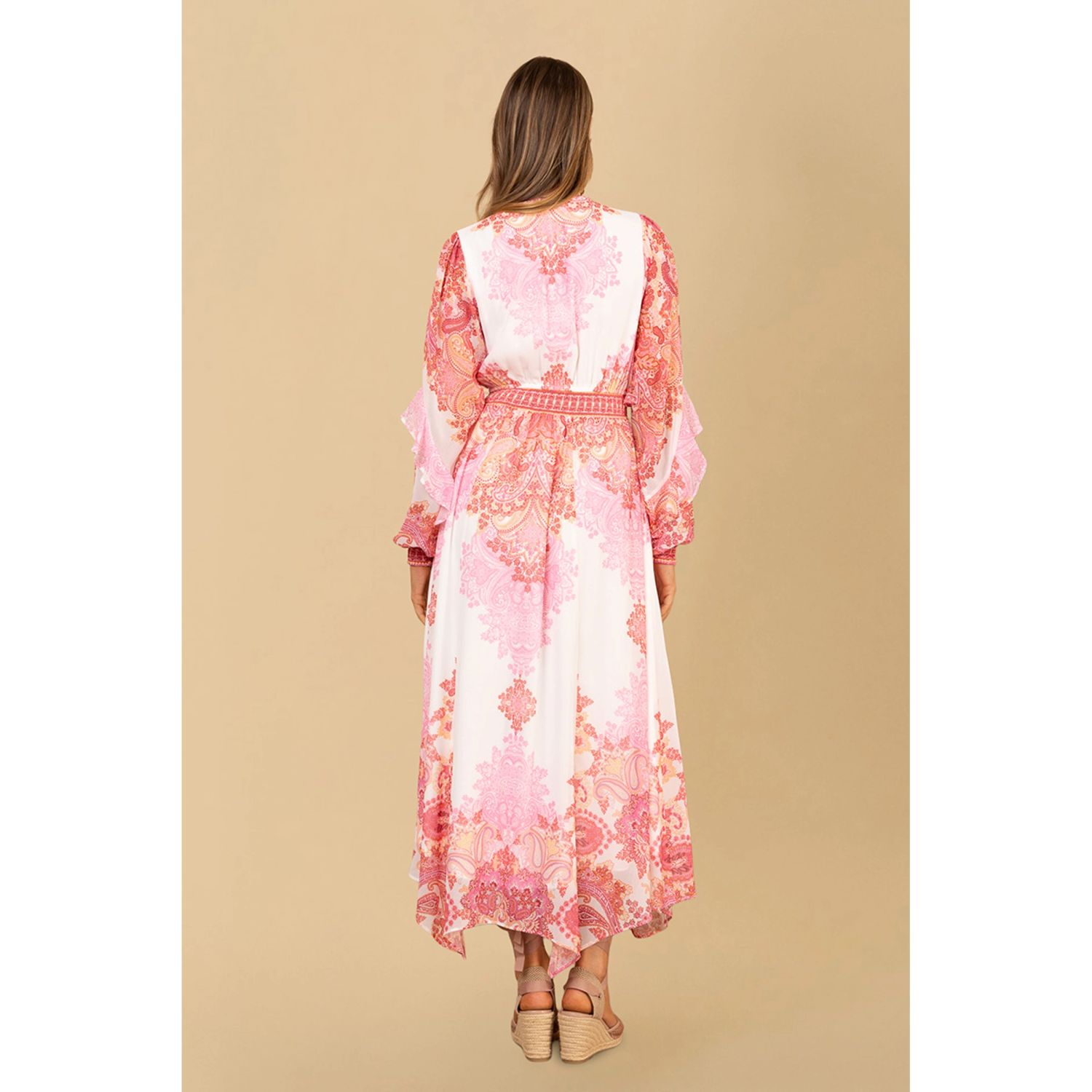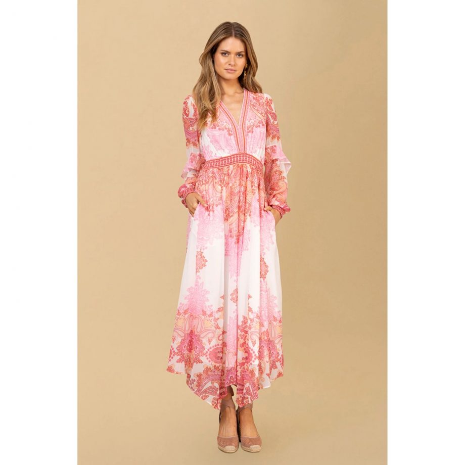 Nydelig kjole med lange volumiøse ermer og V-hals. Kjolen har et nydelig mønster, sidelommer og markert midje.