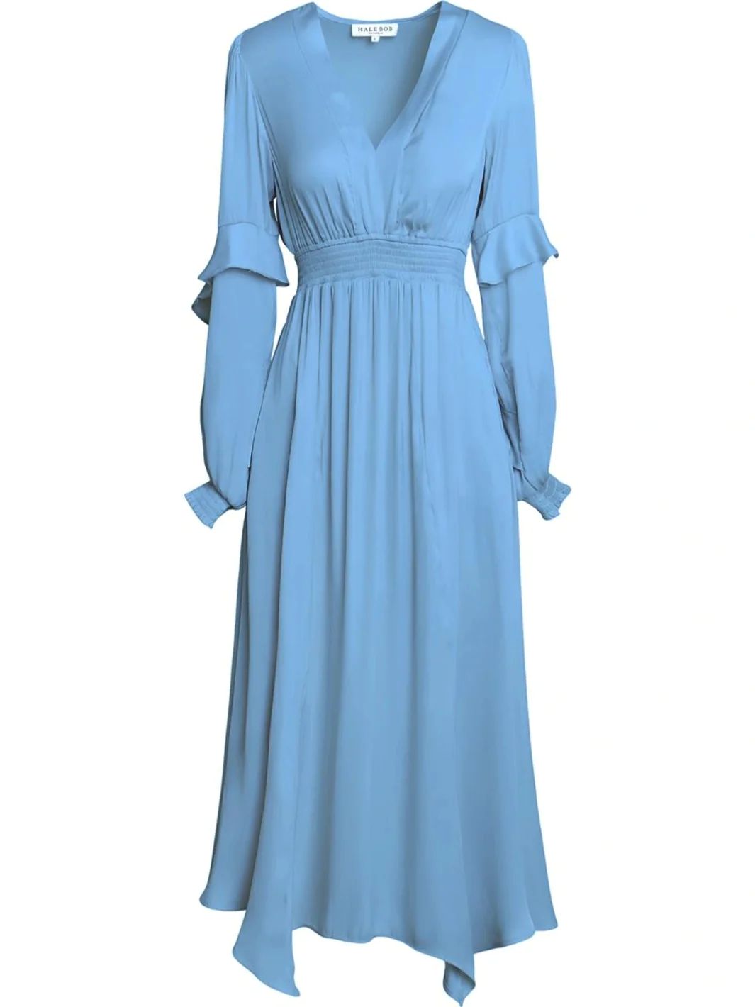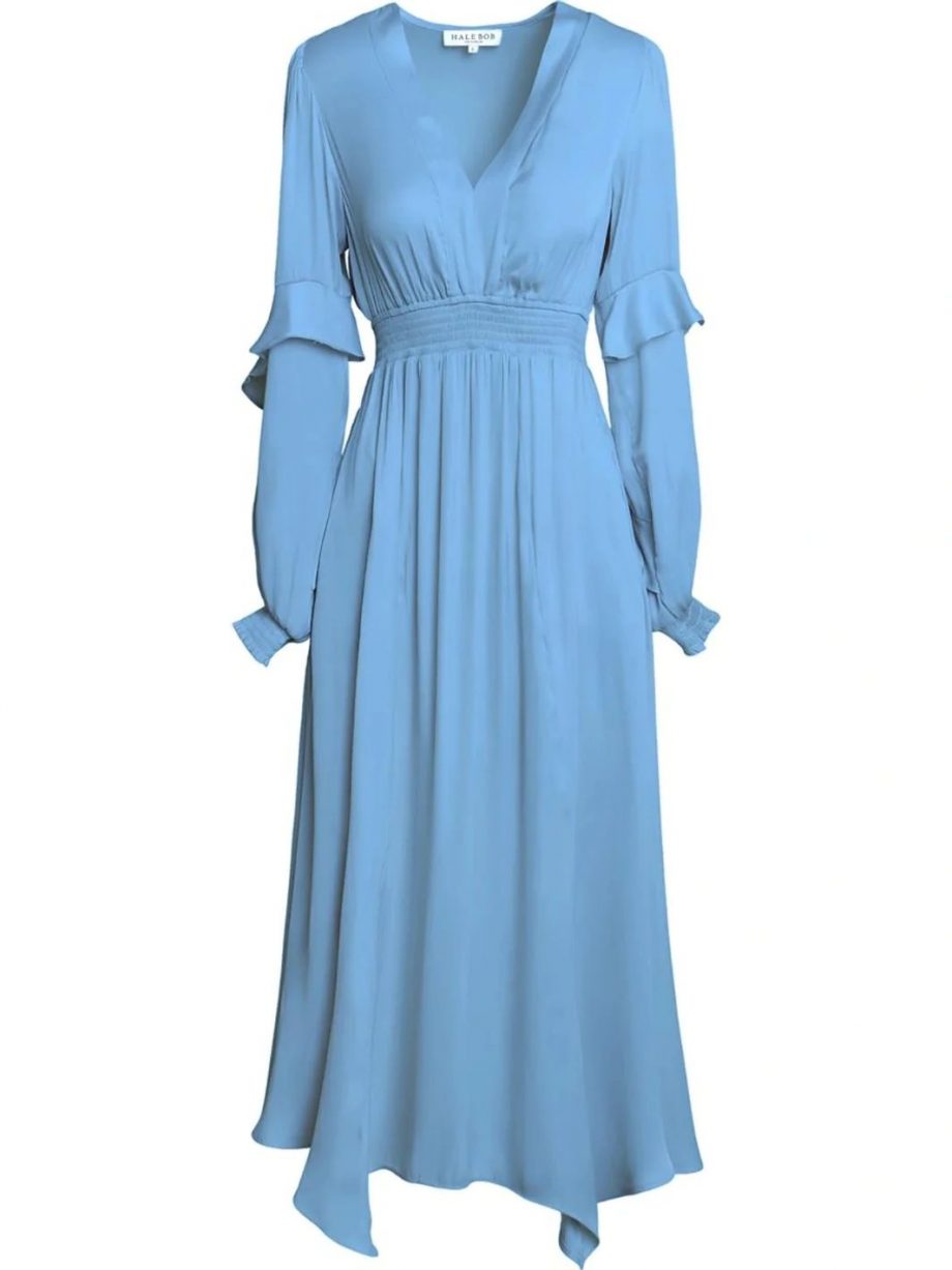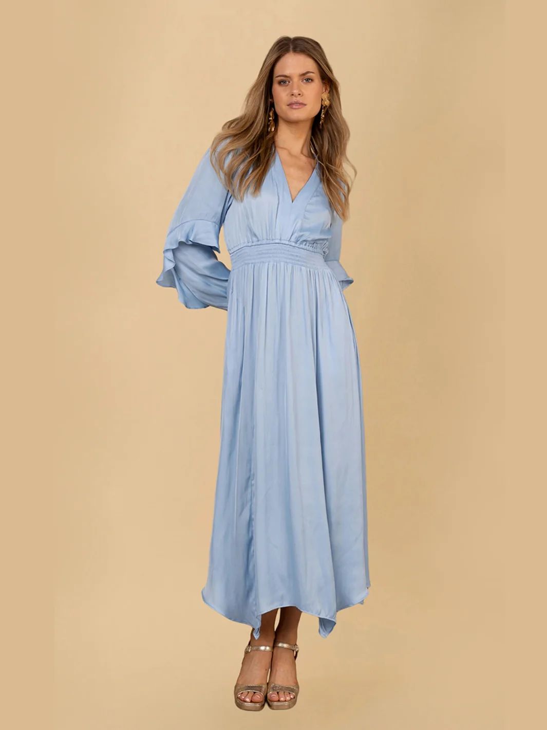Nydelig kjole med lange volumiøse ermer og V-hals. Kjolen har sidelommer og markert midje.