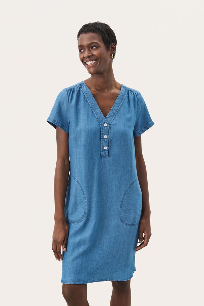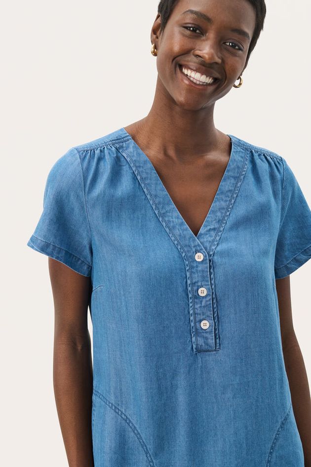 KJolen har korte ermer, V-utringning og lommer i sidene.