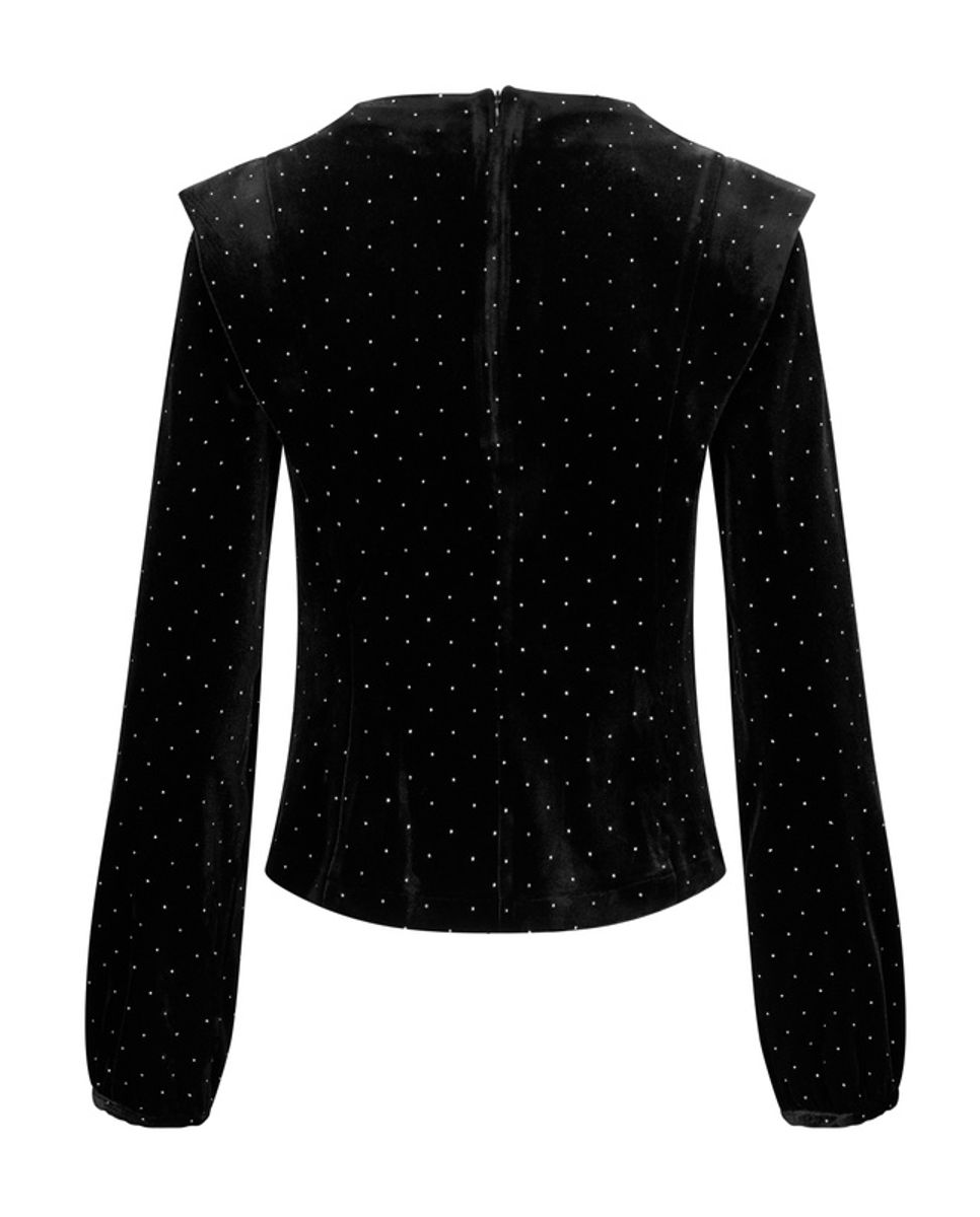 Denne flotte blusen er laget av elastisk velour med nagledetaljer for et stilig preg. Den har rund hals, lange ermer med elastiske mansjetter, avstivede skulderklaffer og glidelås midt bak. Prinsessesømmer og en tettsittende midje former silhuetten. Denne er litt liten på størrelsen,så vipper du mellom størrelser, anbefaler vi å gå opp.