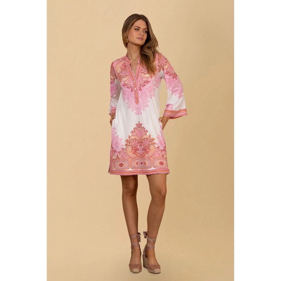 en fargerik og sofistikert kjole som blir en favoritt i sommergarderoben. Denne korte kjolen er dekorert med et nydelig, bohemsk paisley-mønster i friske rosa og oransje toner på en hvit base. Kjolen har en avslappet tunika-fasong med lange ermer som skrår lett ut, samt en kledelig V-utringning med dekorative detaljer langs kanten. Den er laget i en myk og stretchy kvalitet som faller pent og føles behagelig mot huden. Med praktiske lommer i sidene og små splitter nederst, kombinerer den luksuriøs stil med høy komfort.