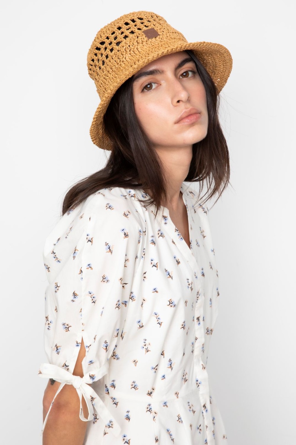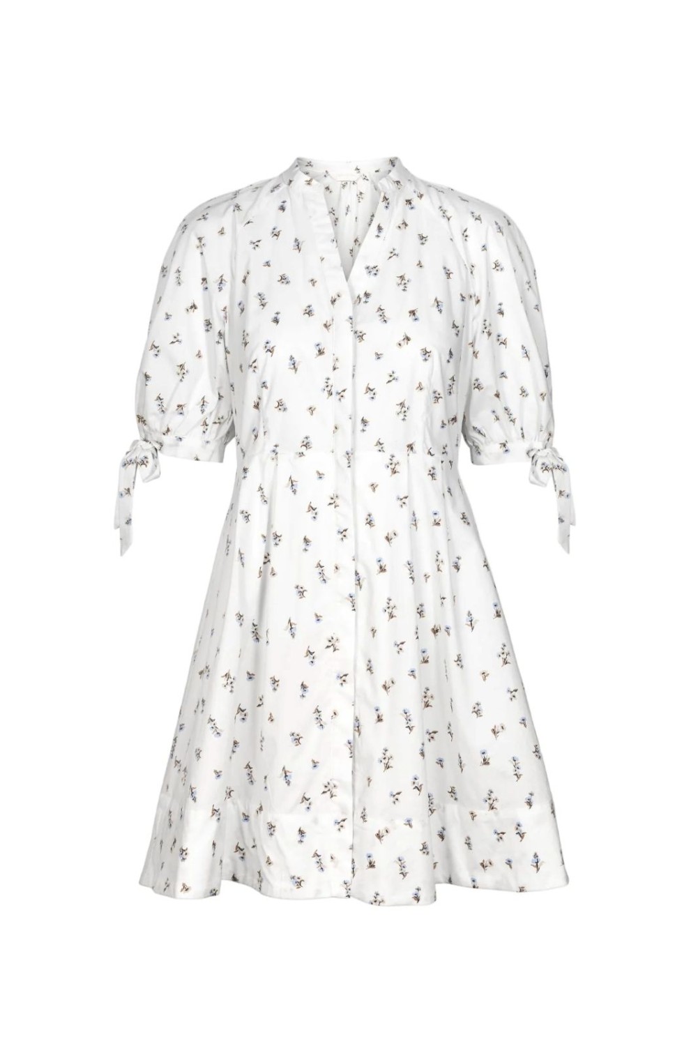 En søt minikjole i en delikat bomullsateng. Kjolen har dekorative puffermer med justerbare knytinger og elegante plissédeltaljer i midjen som gir en feminin silhuett. Den har en flatterende V-utringning og skjult knepping i front, noe som gjør den perfekt til både hverdags og fest.