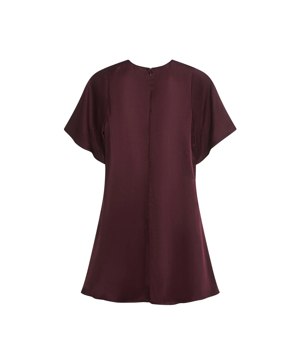 Elegant minikjole med feminin silhuett og gjennomtenkte detaljer som fremhever midjen. Draperingene i front skaper en flatterende effekt, mens skjørtet faller lett i en subtil A-fasong. Kjolen har V-utringning, korte tulipanermer og lukkes med glidelås bak.
