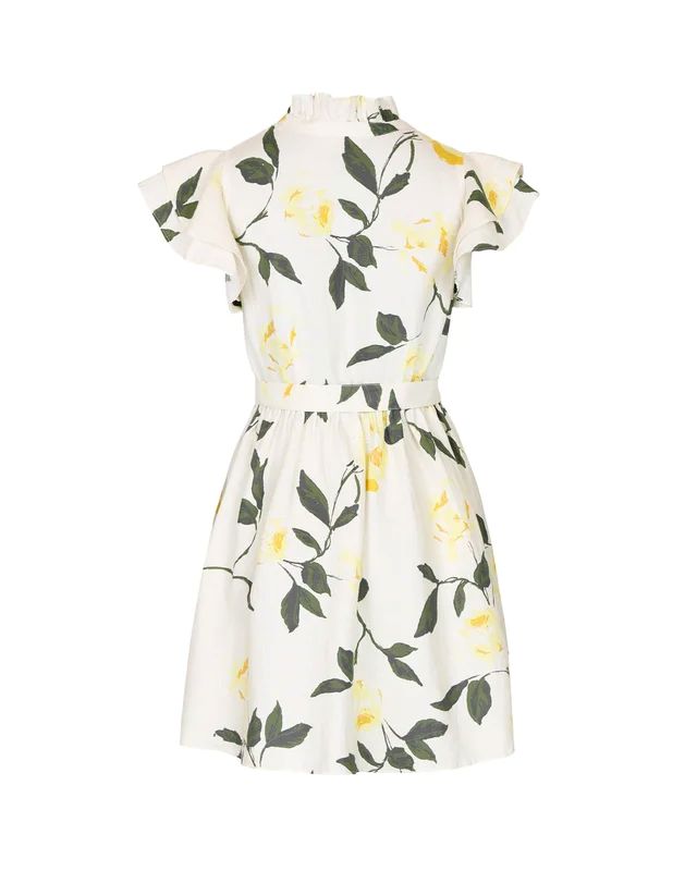 Enlekker sommerkjole som passer like godt med sandaler til hverdags som med smykker og hæler til sommerens festligheter. Det fine blomsterprintet i gult og grønn mot en offwhite bunn skaper et friskt og elegant uttrykk. Kjolen har minilengde, mandarinkrage, korte ermer med volanger og knappelukking på brystet. Med et belte som følger med kan du enkelt markere midjen og få en ekstra detalj. Fin lengde til ca midt på låret som gjør den svært feminim og anvendelig.
