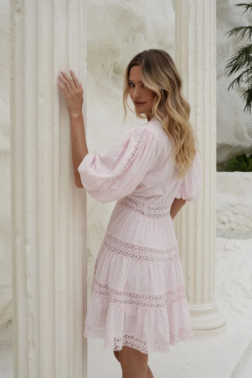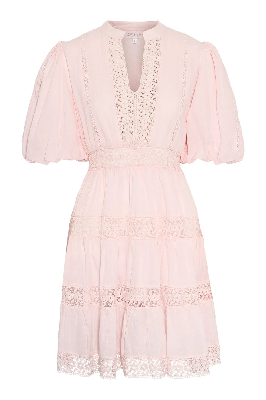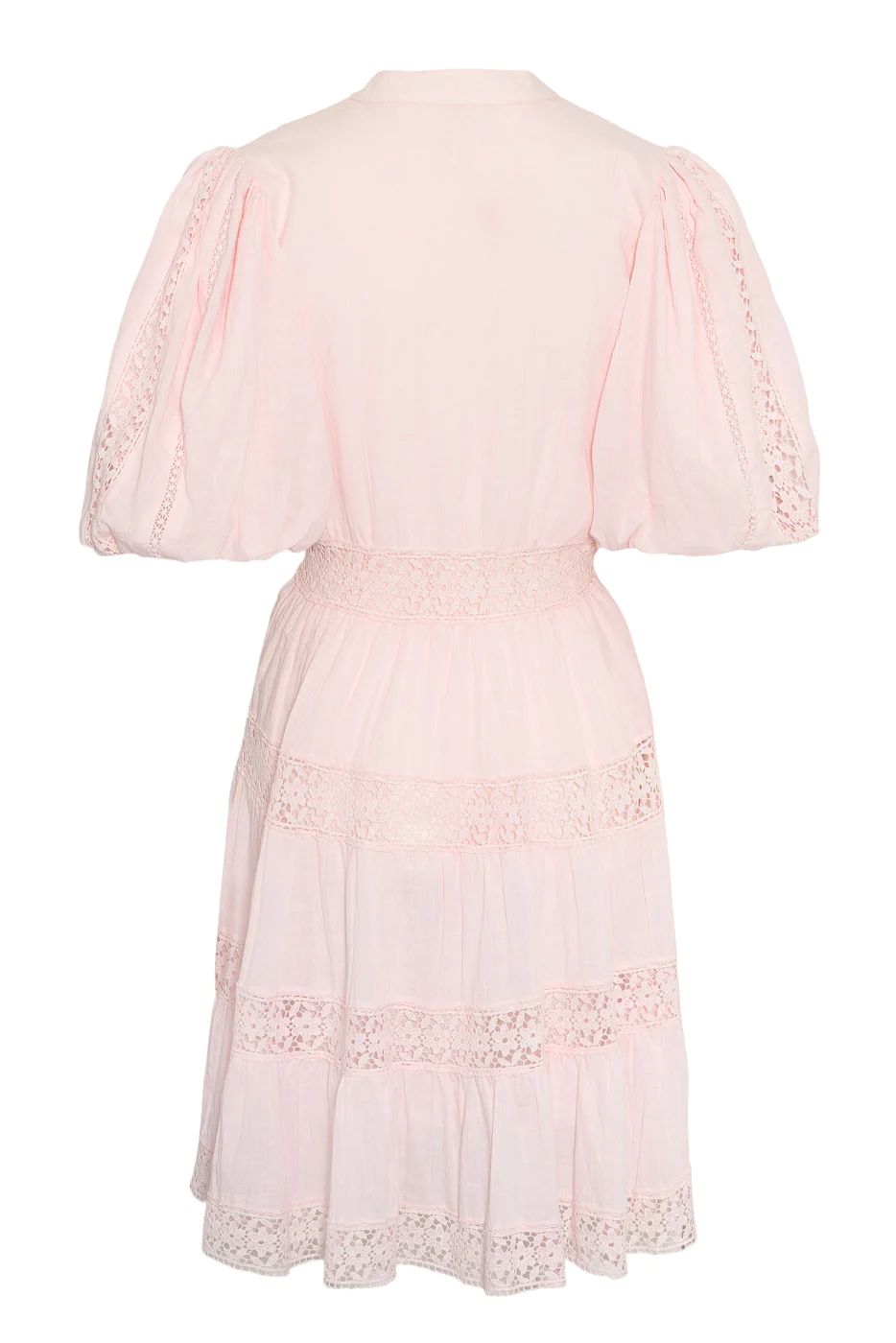En feminin minikjole i en myk rosa fargetone, laget av lett stoff med delikate blondeinnsatser overalt. Designet med voluminøse puffermer, en flatterende V-hals og en definert midje, er denne romantiske stilen perfekt for sommerarrangementer, fester og spesielle anledninger.