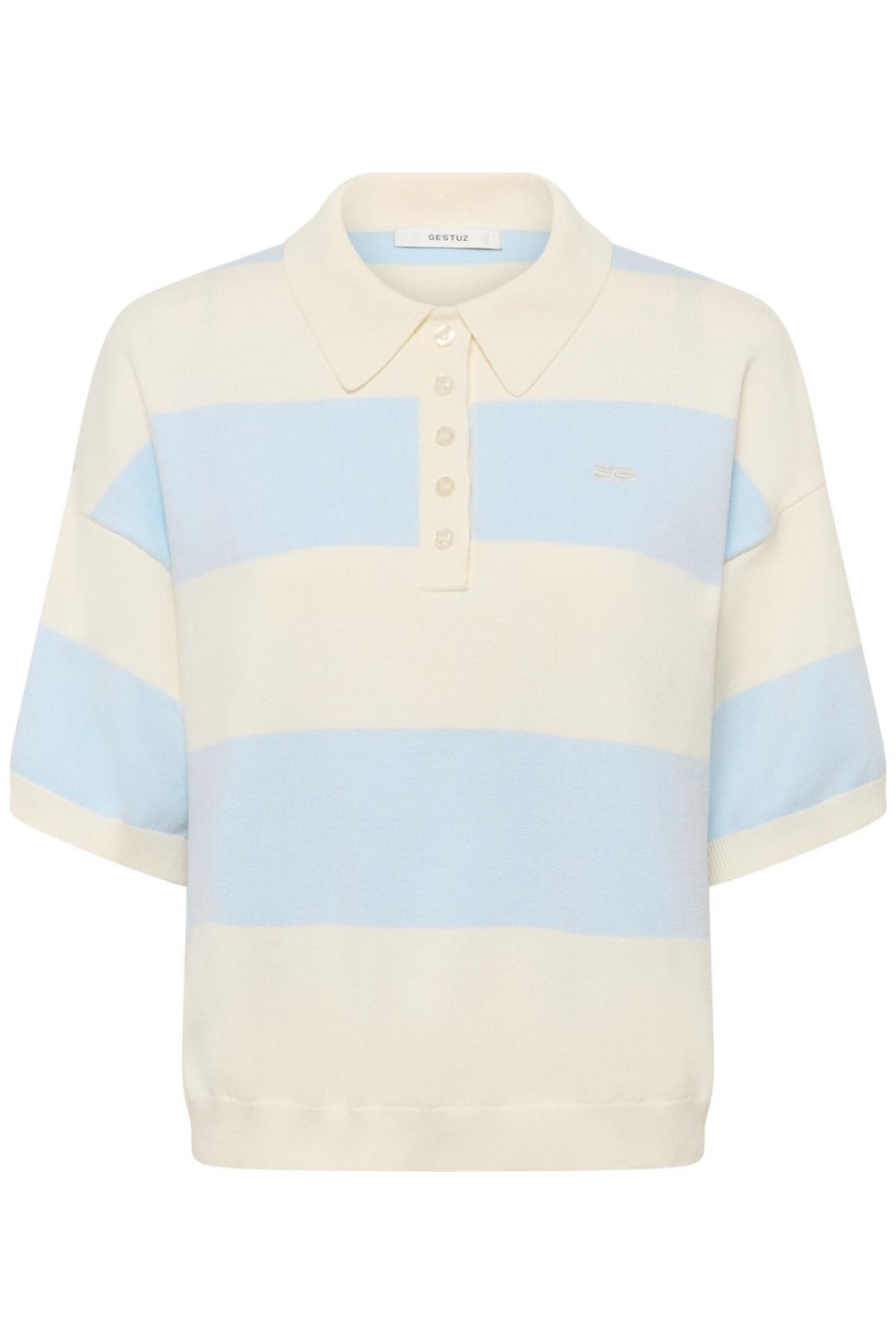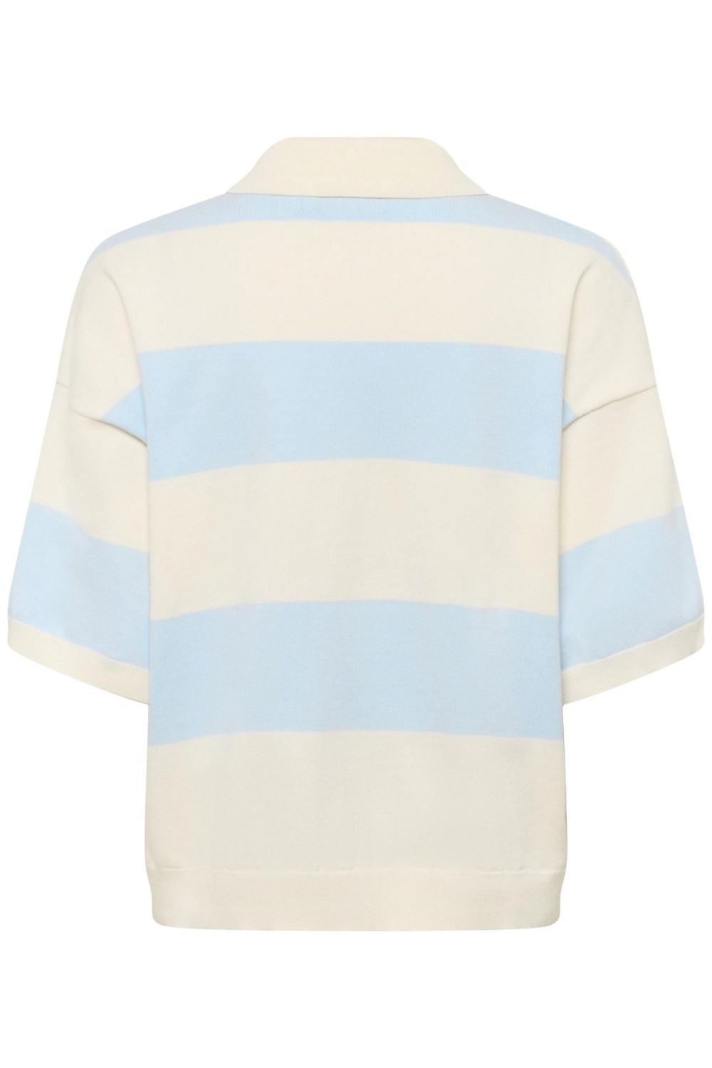 Toppen har en vis fasong, 1/2 ermer og kommer med brede striper i blå/cream.