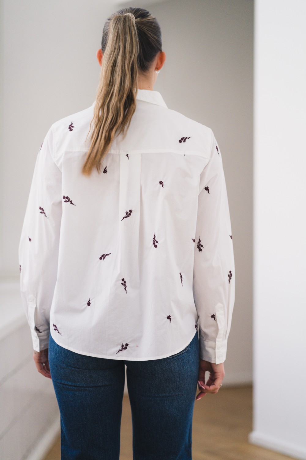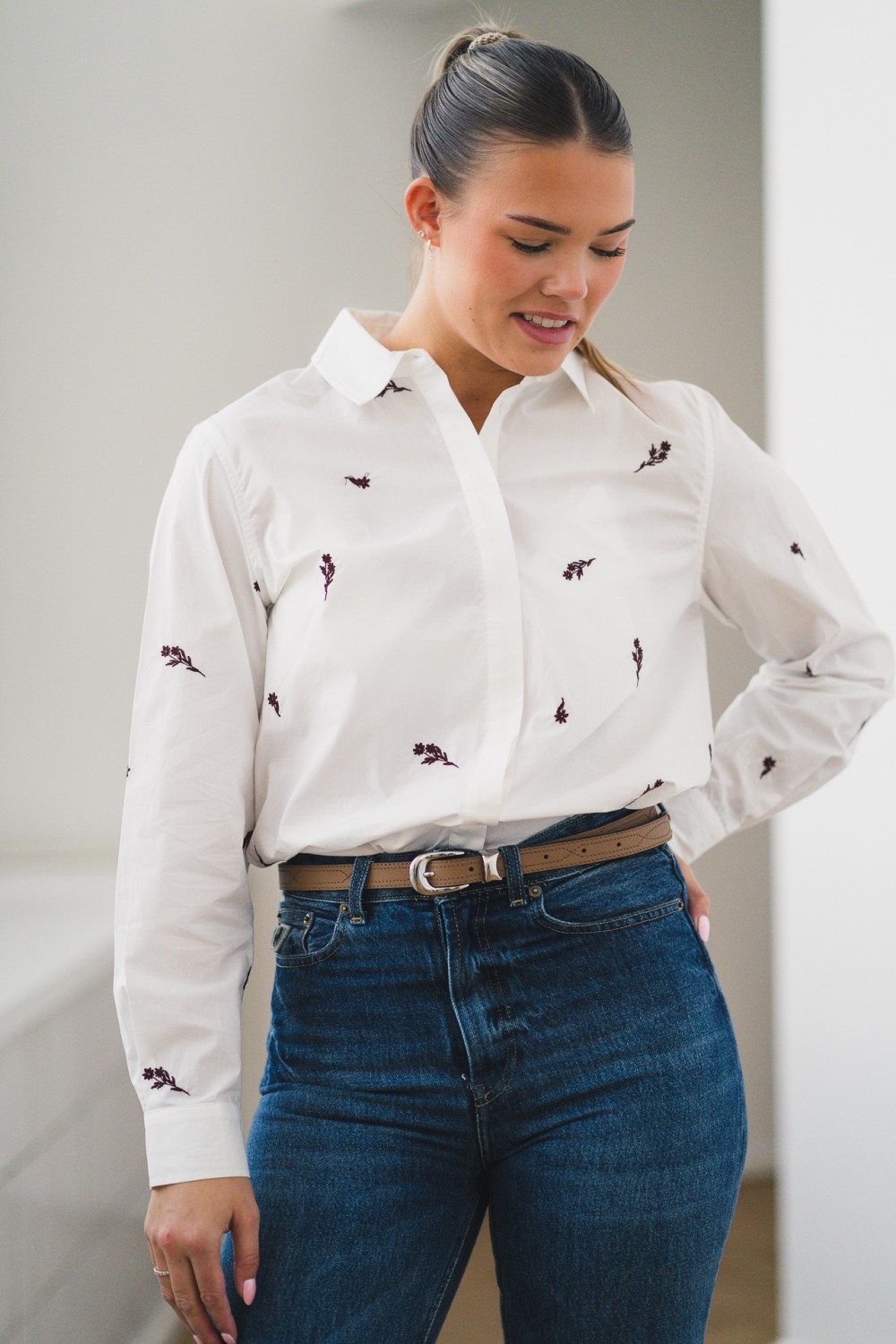 Lekker skjorte i klassisk hvit farge med brodert blomstermønster, og er laget av et mykt materiale som føles behagelig på. Blusen har en flatterende passform med lange ermer og knappelukking i front. Den søte kragen med volanger og de delikate knappene i kragen gir blusen et lekent og feminint preg.