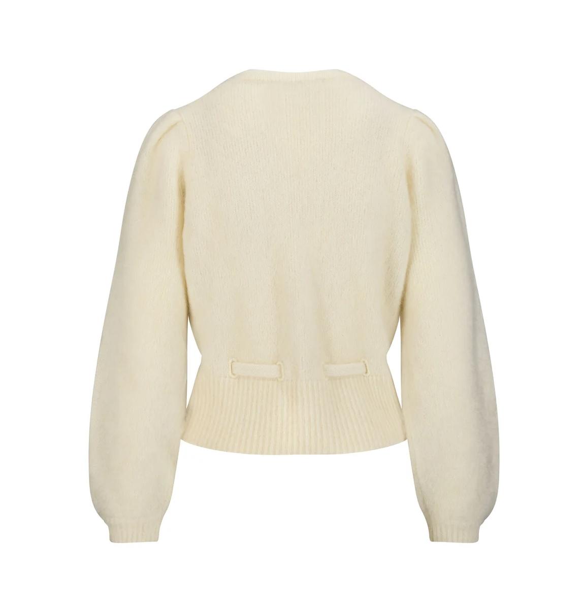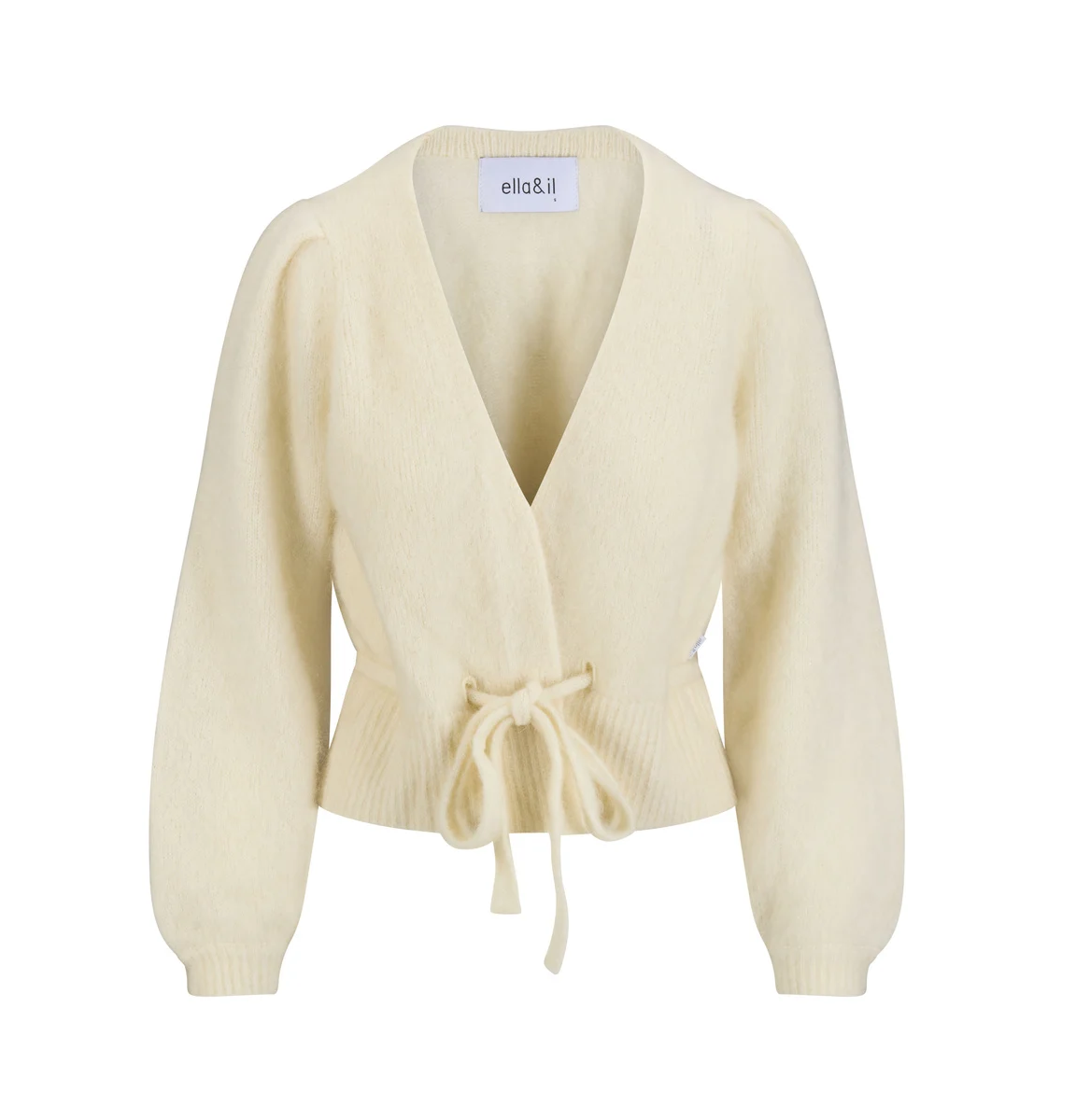En feminin strikkecardigan laget av en grov mohairblanding. Den har en flatterende V-hals, knyting i midjen og en diskret hektefeste på brystet for allsidig styling. Den brede ribbekanten og den litt avkortede lengden gir den et moderne preg, noe som gjør den til et perfekt lag-på-lag-plagg for både avslappet og elegant antrekk.