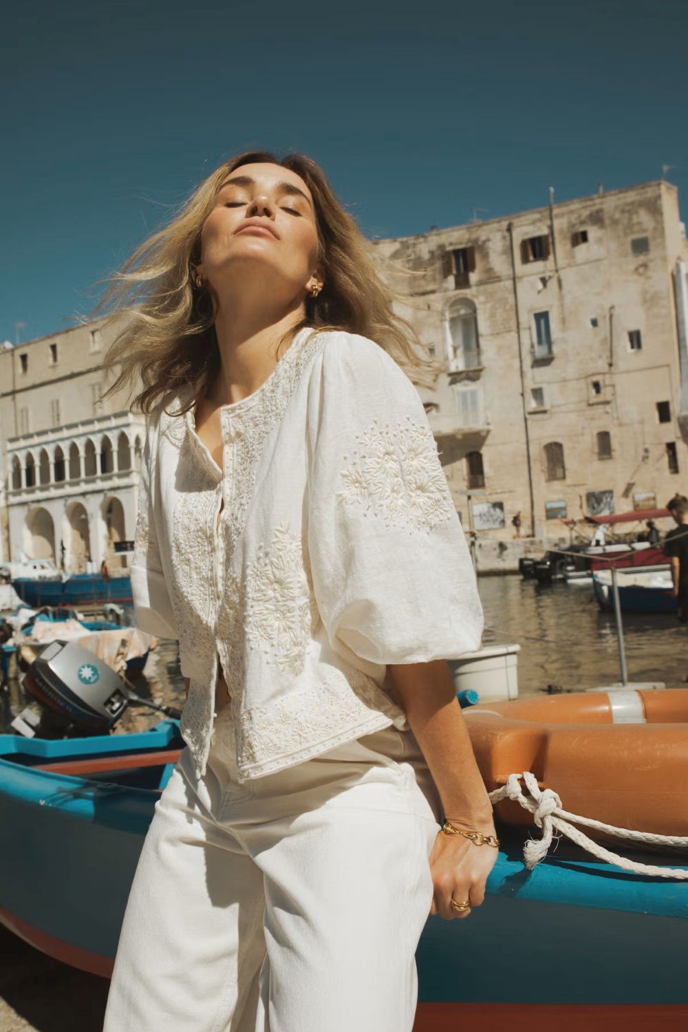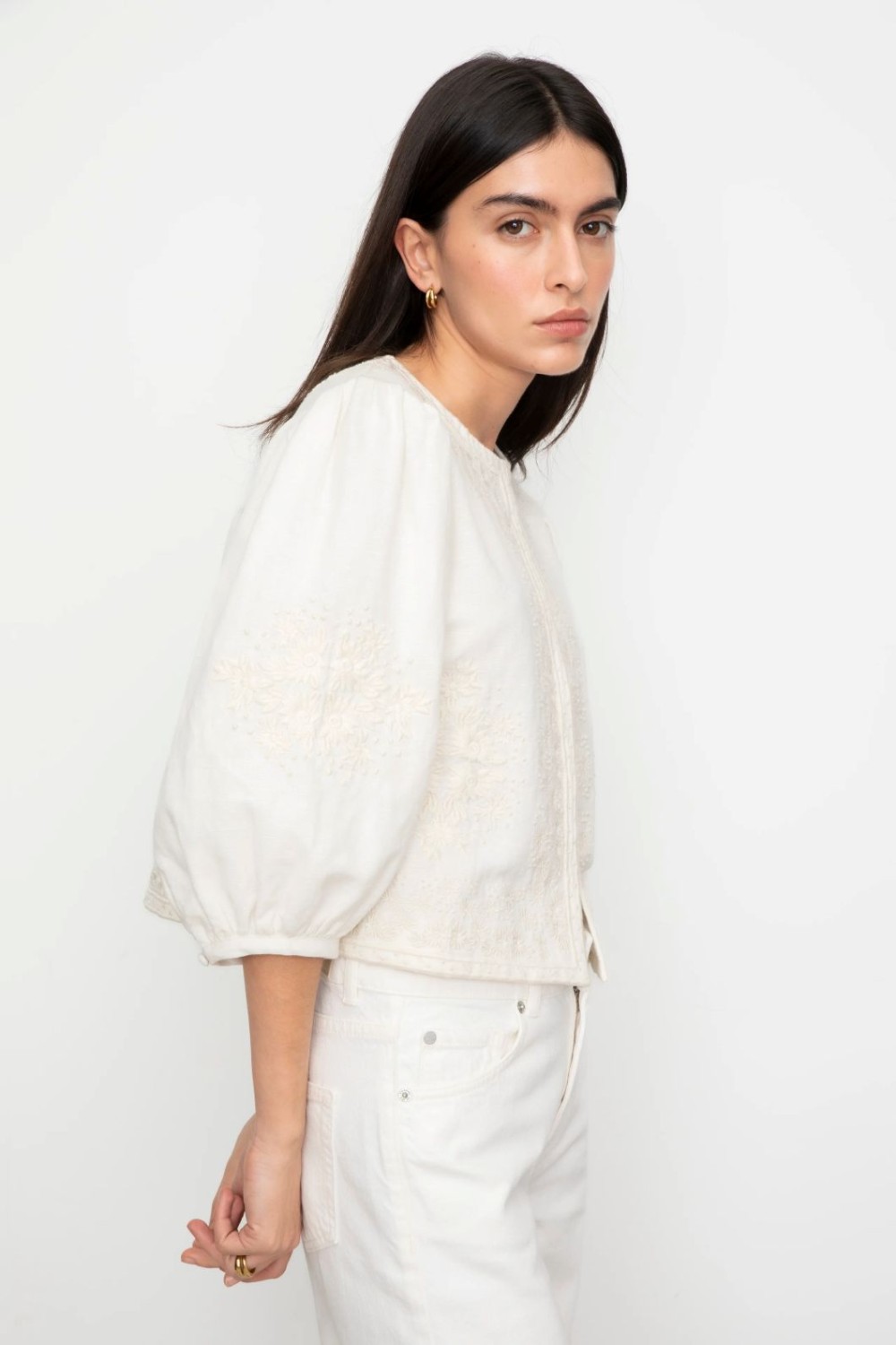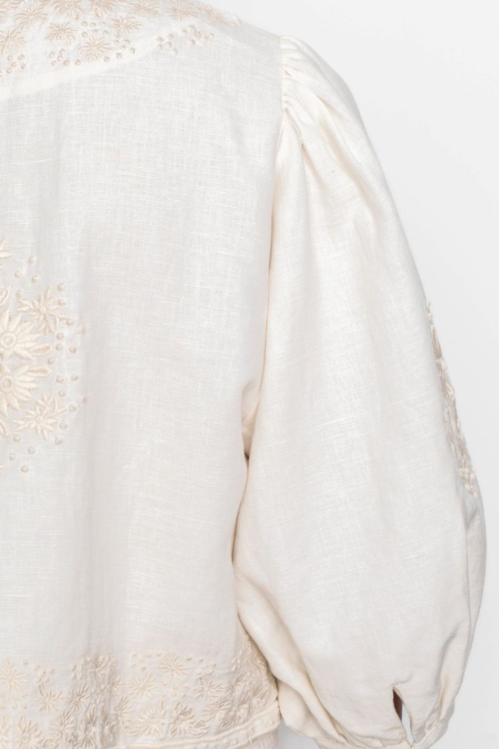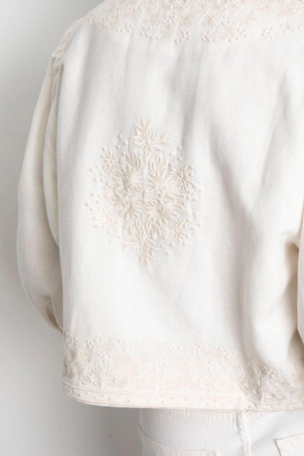Superfin kort jakke i en myk linblanding med delikate broderidetaljer. Den er designet for en løs passform med skjult krok-og-hake-lukking midt foran og trekvartlange ermer. Hvis du er mellom to størrelser, anbefaler vi å gå opp en størrelse.