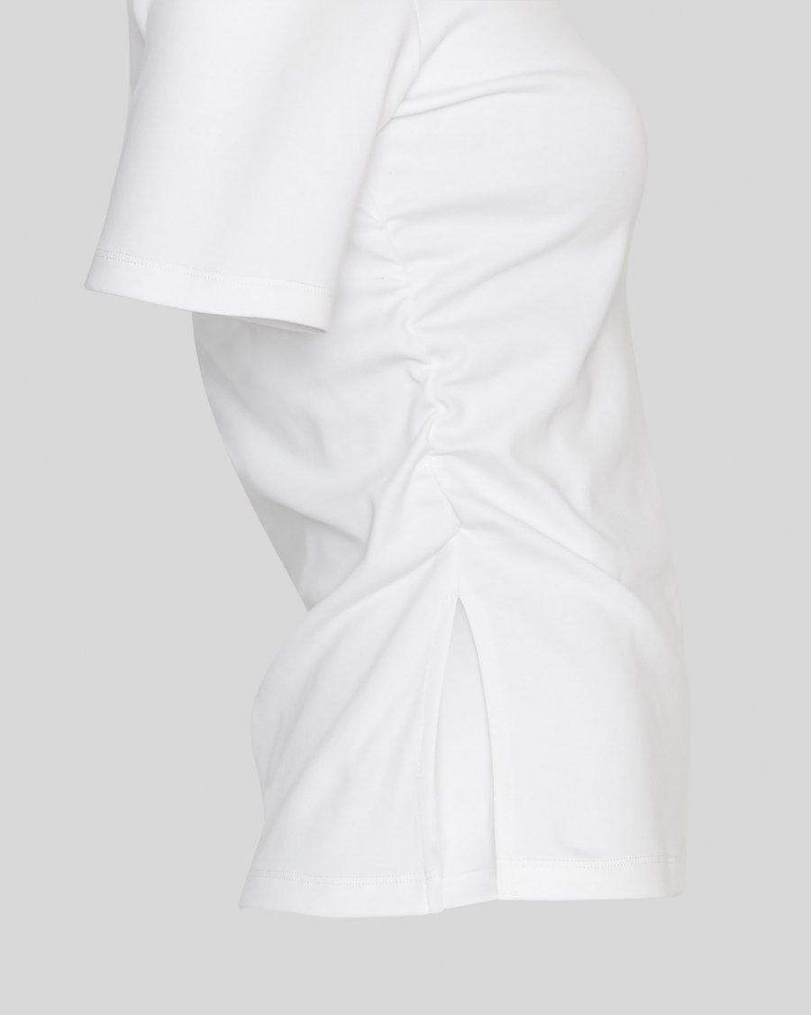En enkel men lekker T.shirt som enkelt kombineres med resten av garderoben din. T-skjorten kommer i klassisk hvit farge og har splitter i sidene med rynkesøm som gir en flatterende passform. Den har rund hals og korte ermer.