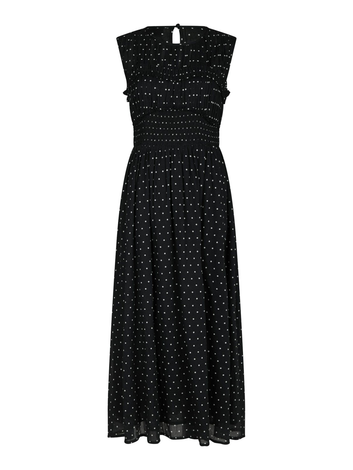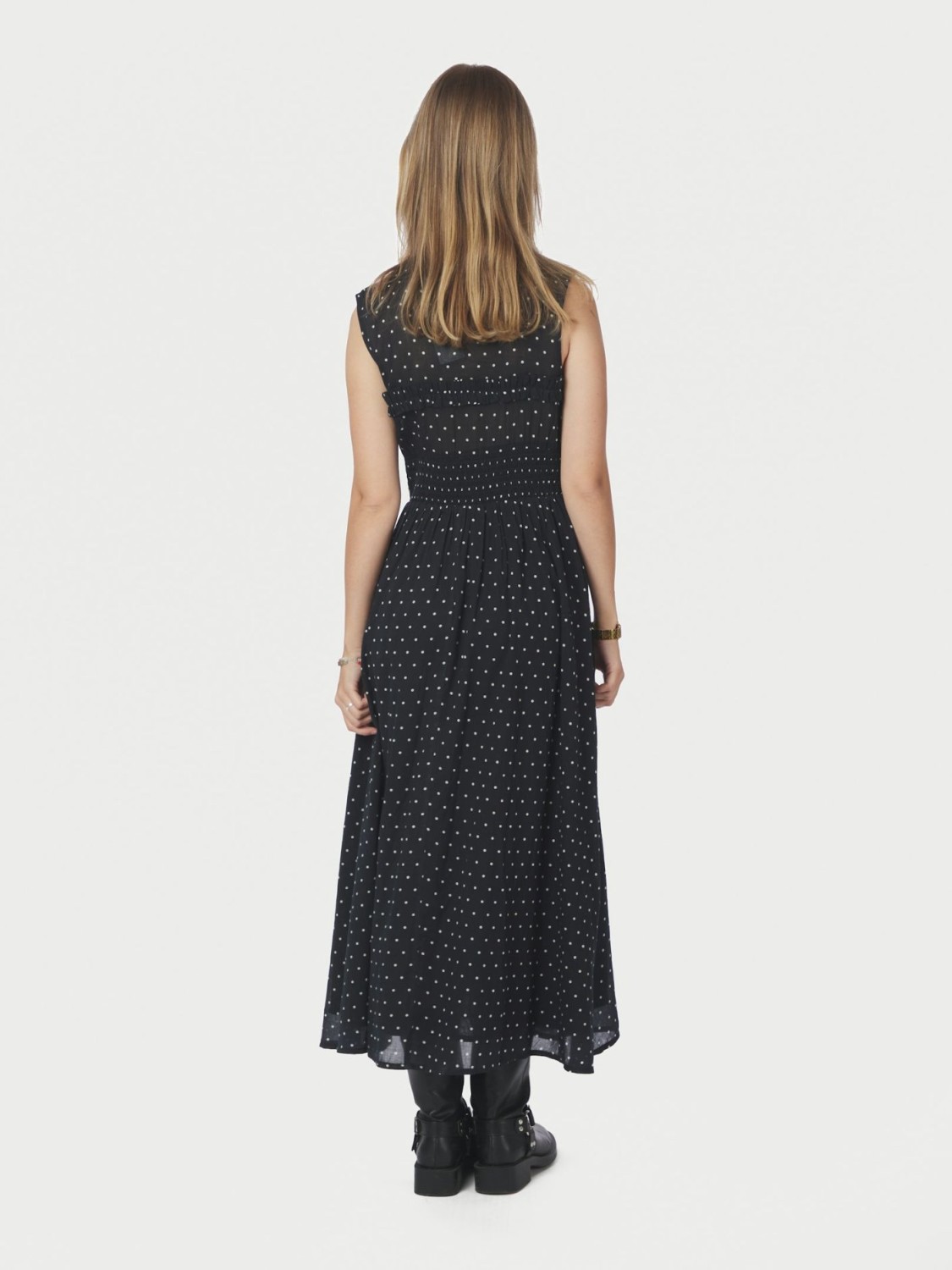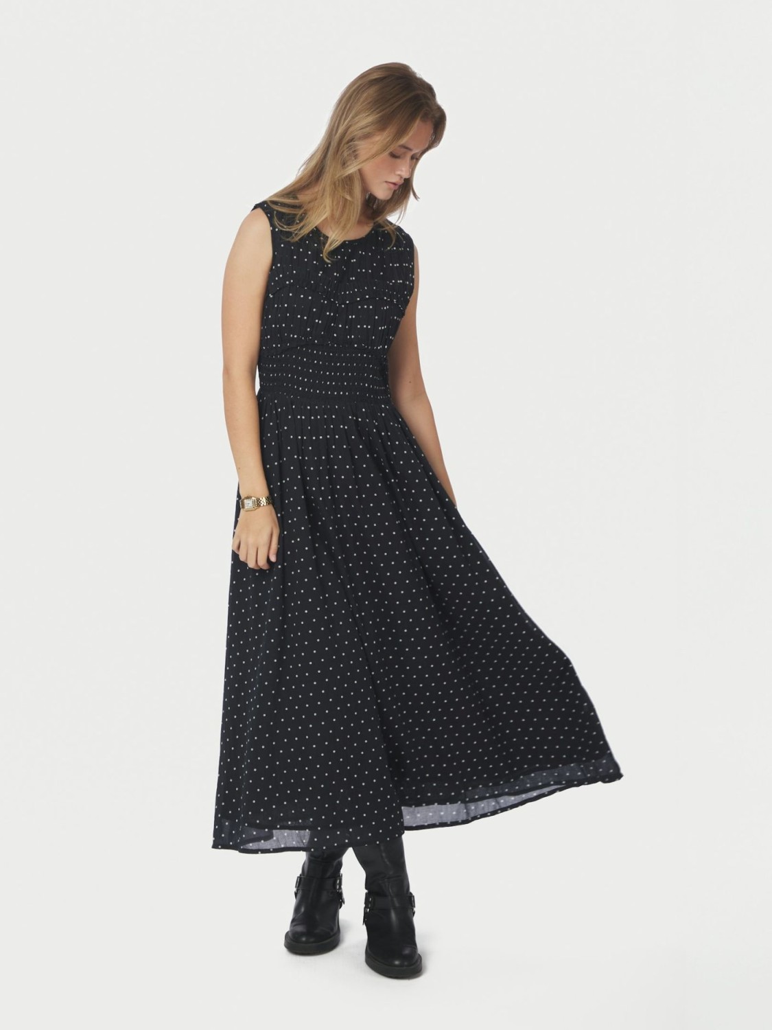 Søt prikkete kjole med smock og volangdetaljer. Kommer i en fin bomull voile kvalitet. Sort i bunn med hvite prikker.
