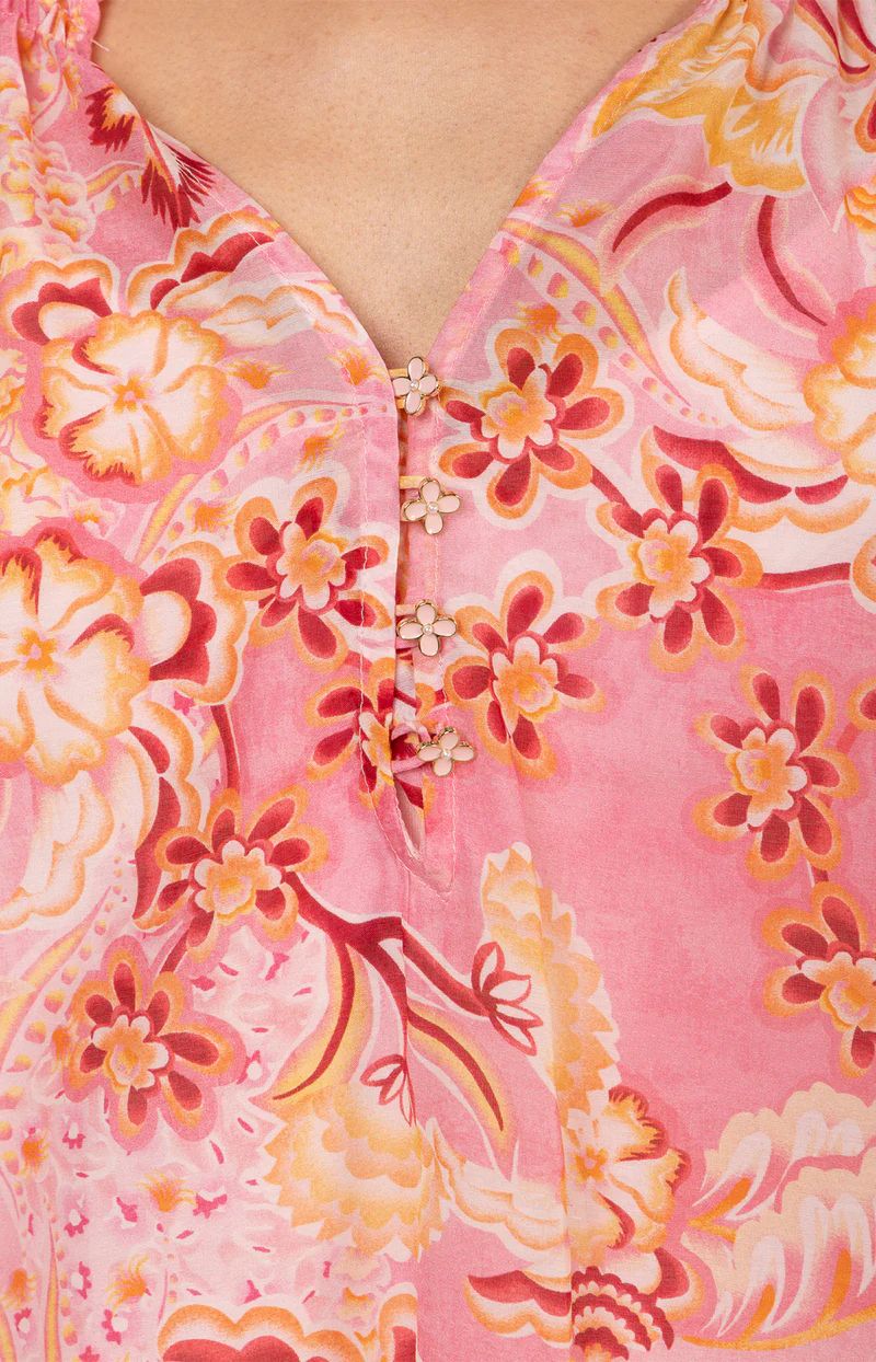 Blusen har V-hals med søte små knapper og lange ermer med strikk nede.