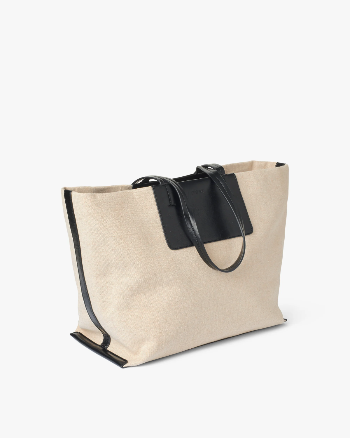 Denne vesken er designet i lin og har detaljer i et skinnlignende materiale. Vesken er åpen og har to innvendige lommer der du kan oppbevare småting. Hovedrommet har plass til en datamaskin, og vesken kan bæres over skulderen.
