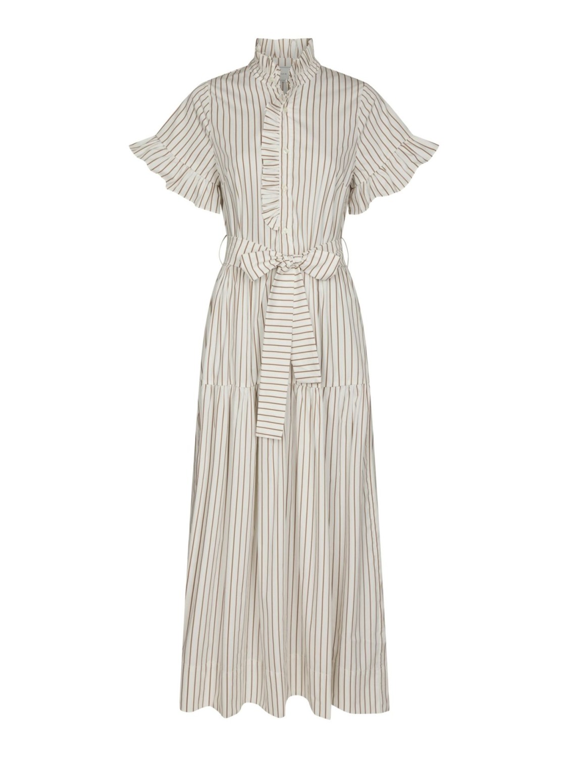 Kortermet kjole i bomullspoplin med striper. Den har lommer i sidesømmene, volangdetaljer på ermene og kragen, og knapper foran. Livet har strikk bak og det følger med bånd til midjen.