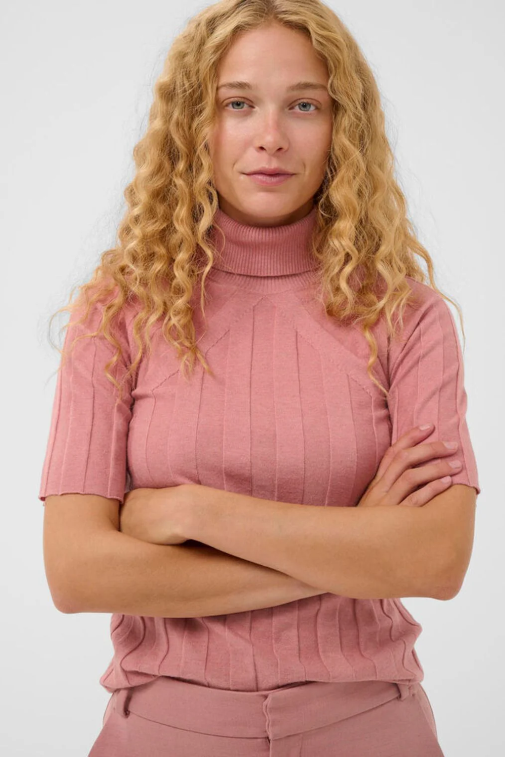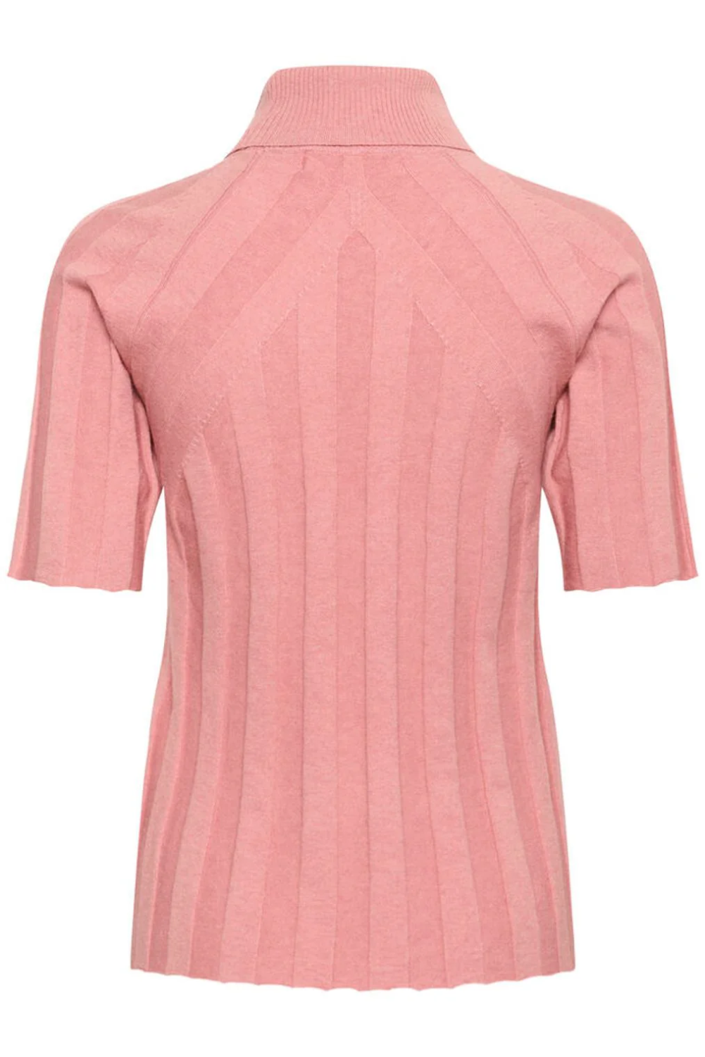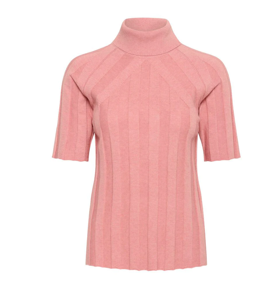 En elegant kortermet genser i en nydelig rosafarge. Genseren er laget i en myk og luksuriøs blanding av viskose, ull og kasjmir og har en delikat ribbestrikket struktur som gir en flatterende, ettersittende passform. Den høye halsen og de korte ermene skaper en sofistikert og moderne silhuett.