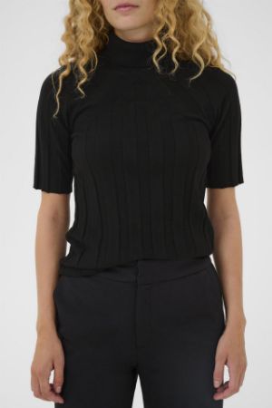 En elegant kortermet genser i en klassisk sortfarge. Genseren er laget i en myk og luksuriøs blanding av viskose, ull og kasjmir og har en delikat ribbestrikket struktur som gir en flatterende, ettersittende passform. Den høye halsen og de korte ermene skaper en sofistikert og moderne silhuett.