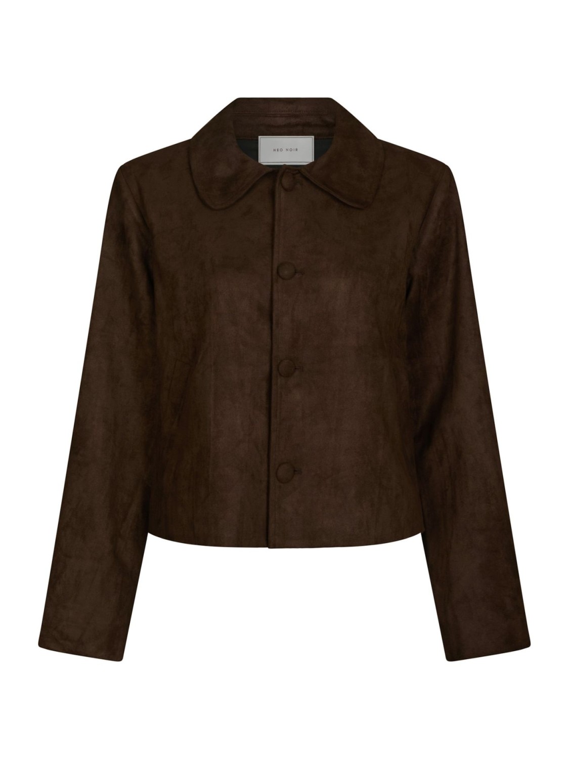 Mørkebrun, semsket skinnjakke med lommer foran. Jakken kommer i en kvalitet som ligner semsket skinn.