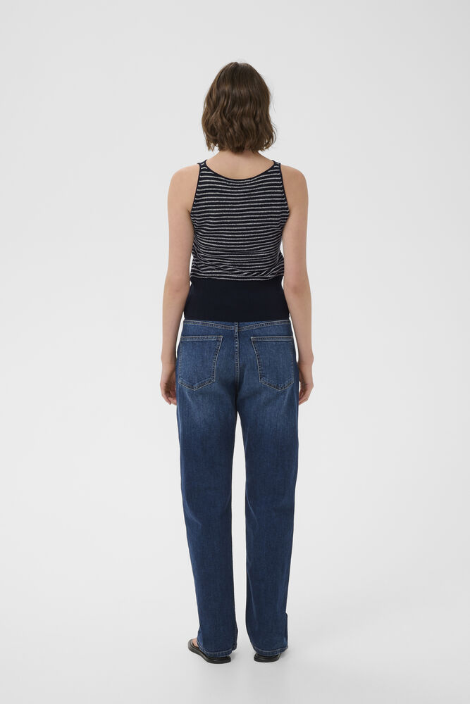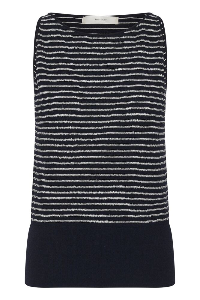Ermeløs topp med rette striper, rett passform og myk finish. Klassisk rund hals og bred kant nederst for et avslappet, moderne uttrykk.