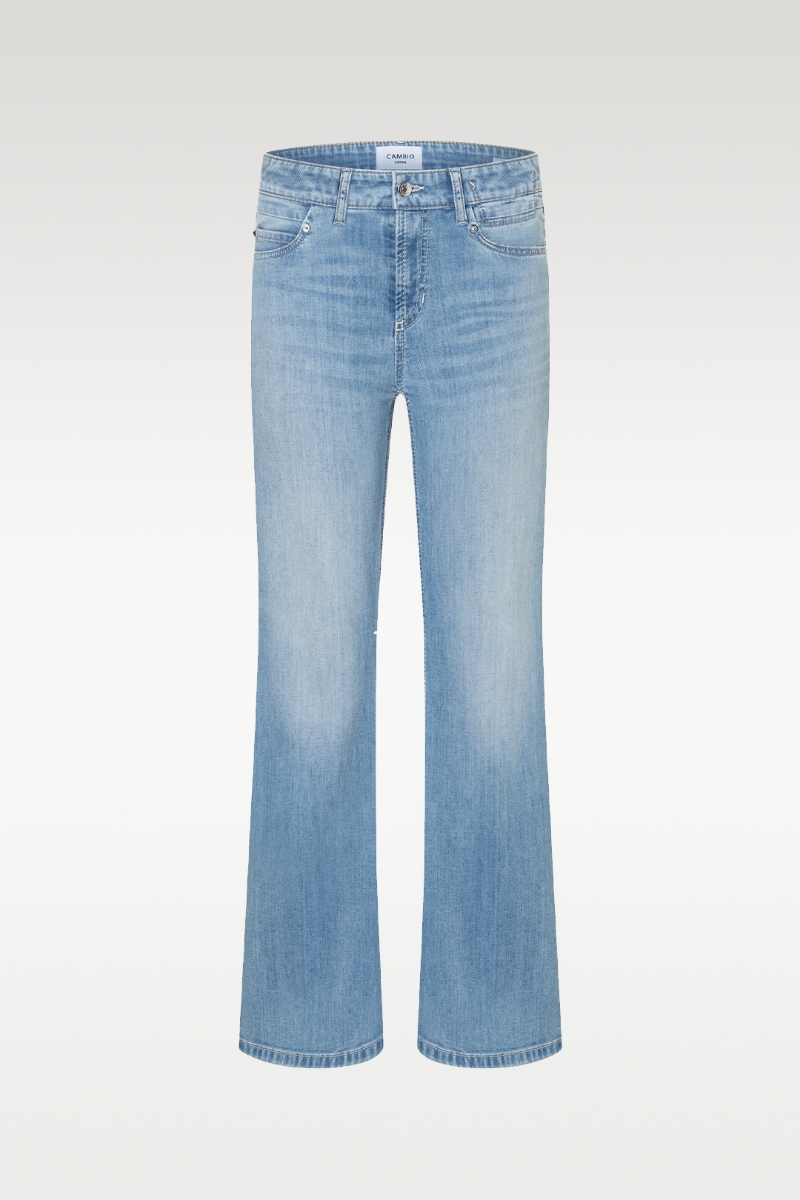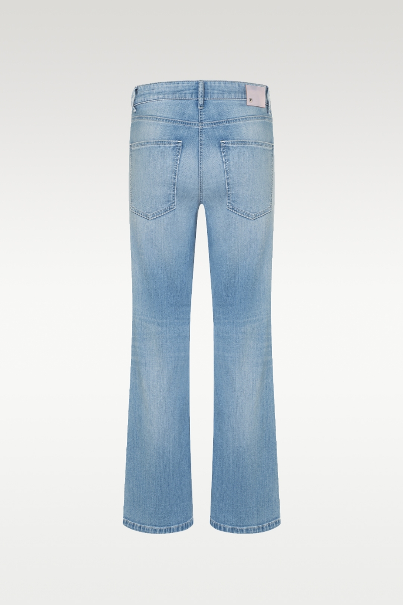 Modellen har normalt høyt liv som gir god støtte og en komfortabel passform rundt midjen. Den klassiske 5-lommersdesignen og beltehemper i linningen gir et tidløst uttrykk. Den smale passformen over hofter og lår går over i en subtil sleng fra kneet, noe som skaper en lang og elegant linje.