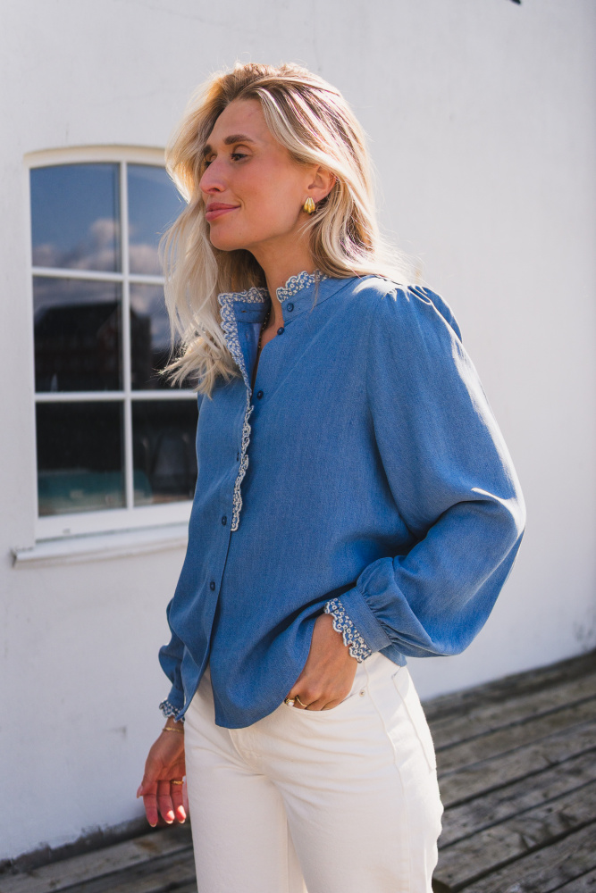 En nydelig skjorte laget av myk denim-tencel. Skjorten har en klassisk krage, lange ermer med mansjetter, rett passform og knappelukking i front. Med sin behagelige kvalitet av 100% tencel og den klassiske blå denimvasken er dette absolutt en tidløs favoritt. Skjorten har delikate og stilfulle rysjer rundt hals og ned til brystet, samt rundt mansjett som gir et feminimt preg. En allsidig skjorte som er et flott tilskudd i basegarderoben. Like fin til dressbukser som til jeans.