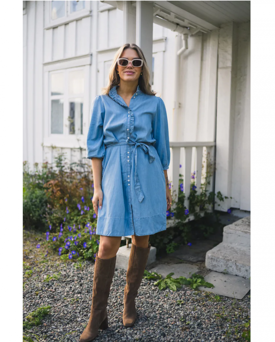 Superfin kjole i myk denim-tencel. Kjolen har delikate og feminine rysjer rund hals langs knappestolpe ned til bryst, og 3/4 lengde på ermer med mansjett. Passformen er rett og avslappet, og knytebåndet i midjen lar deg justere kjolen slik du vil. Lengde til rett over kneet.