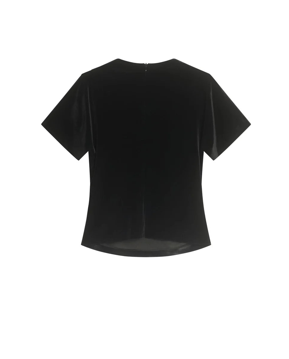 Elegant topp laget i en delikat stretchfløyel. Modellen er designet med en høyt skåret hals, skjult glidelås bak, korte ermer med et avrundet skulderparti og legg foran for å skape en lett drapert effekt. Rett til noe ettersittende i fasongen.