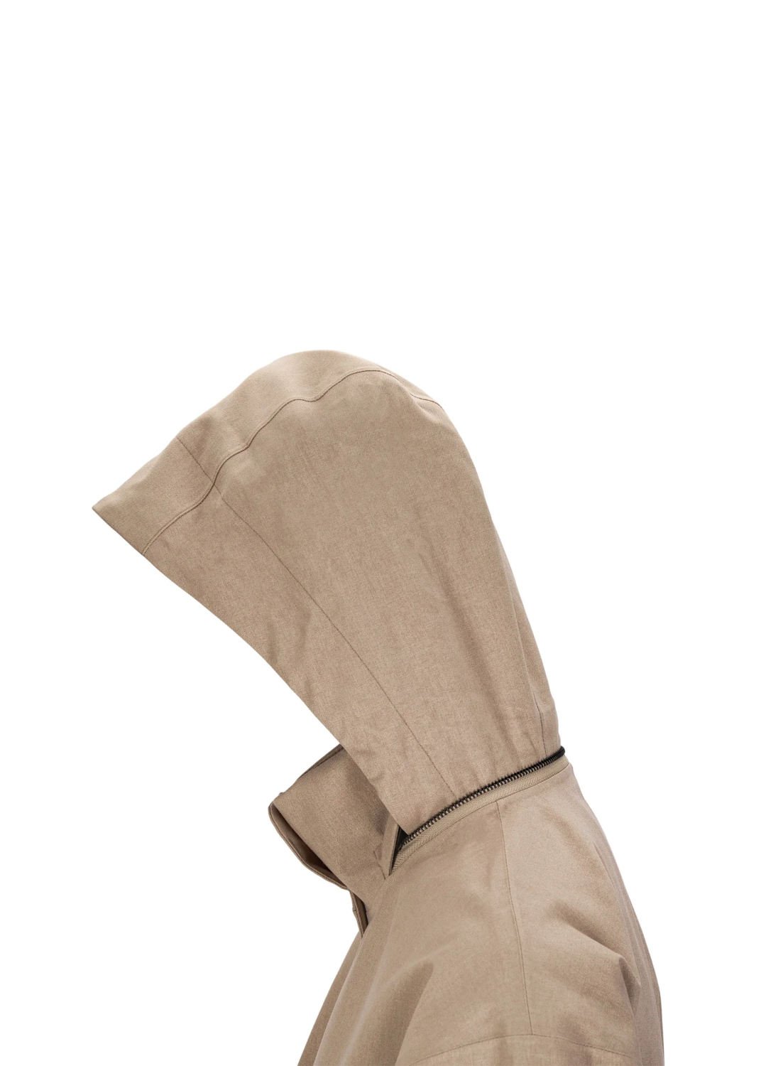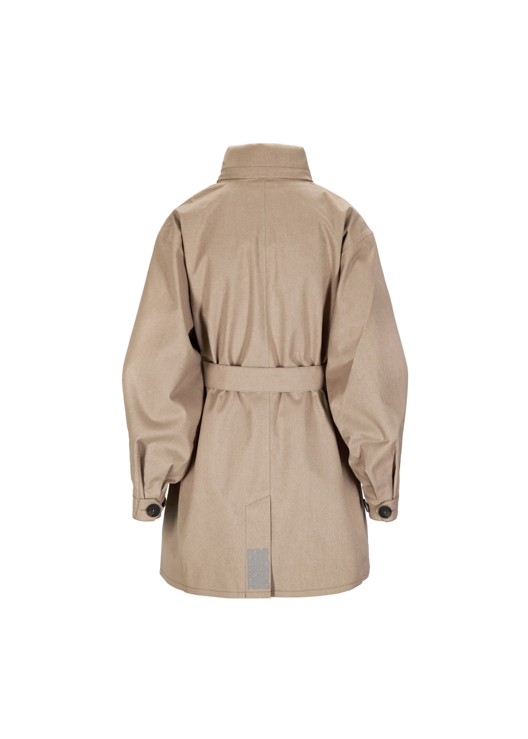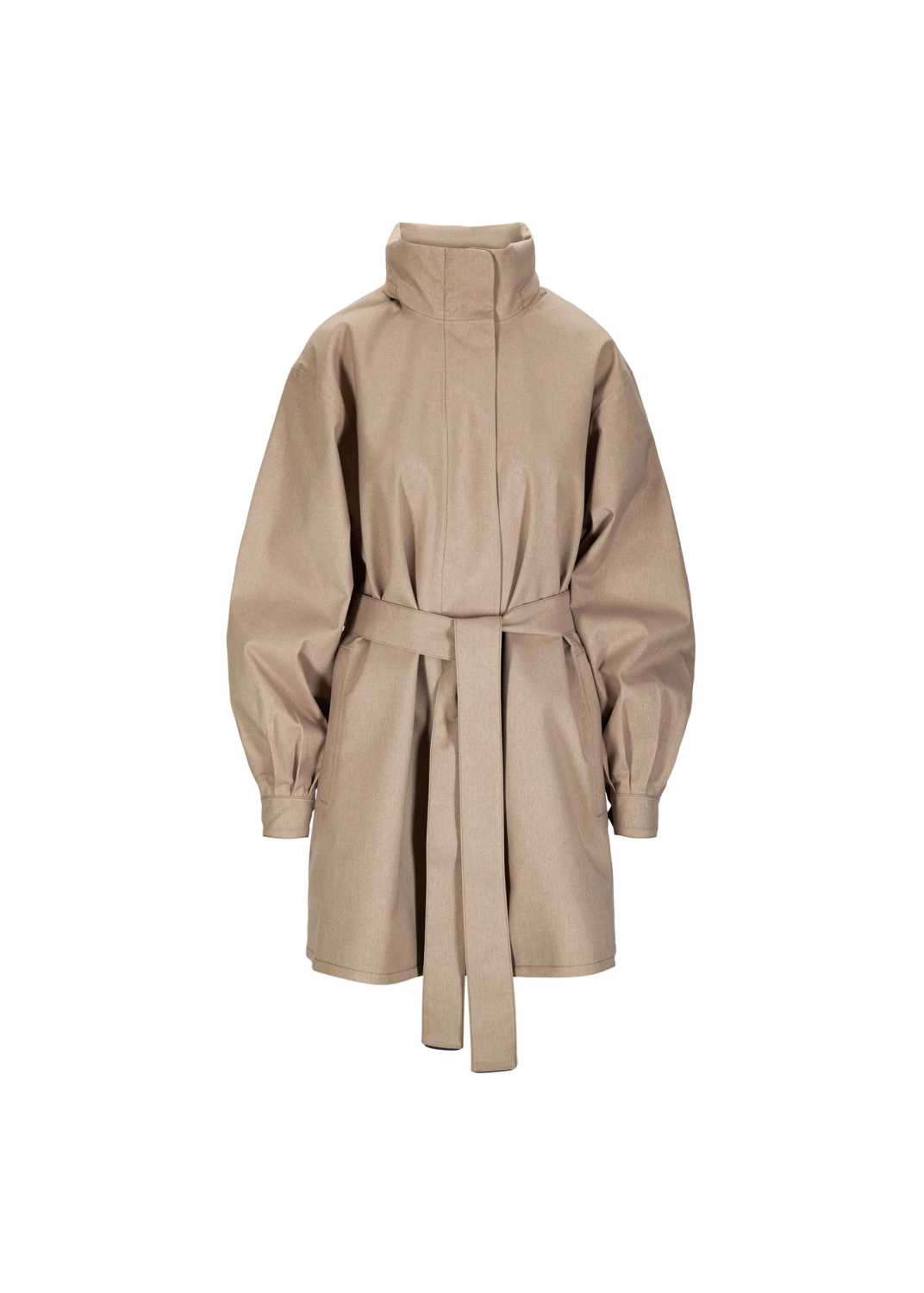 En feminin og vanntett regnjakke laget i resirkulert stoff. Regnfrakken har ballongermer og belte i midjen, som får silhuetten din til å skinne. Skjult hette i krage.