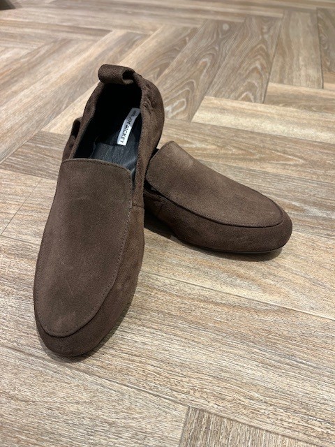Klassiske loafers i en lekker mørkbrun farge. Skoene sitter pent på foten, har lav hæl og rund tå. Skoene er laget av mykt semsket skinn.