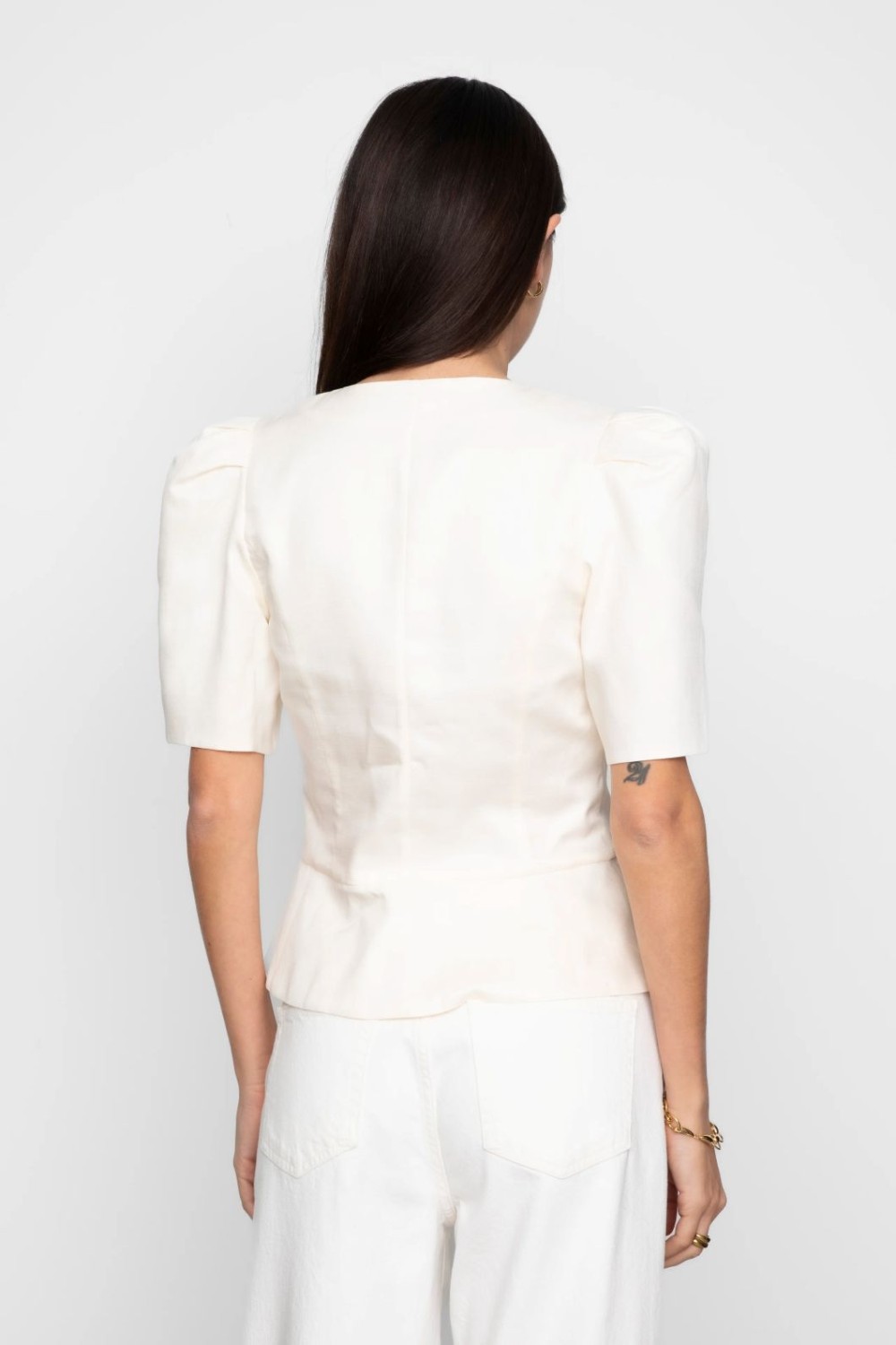 Sabina-blusen er laget av en delikat tencell-linblanding, kuttet med peplum i midjen for en feminin silhuett. Den er detaljert med stoffkledde knapper langs frontlukkingen, noe som gir et mykt og elegant utseende.