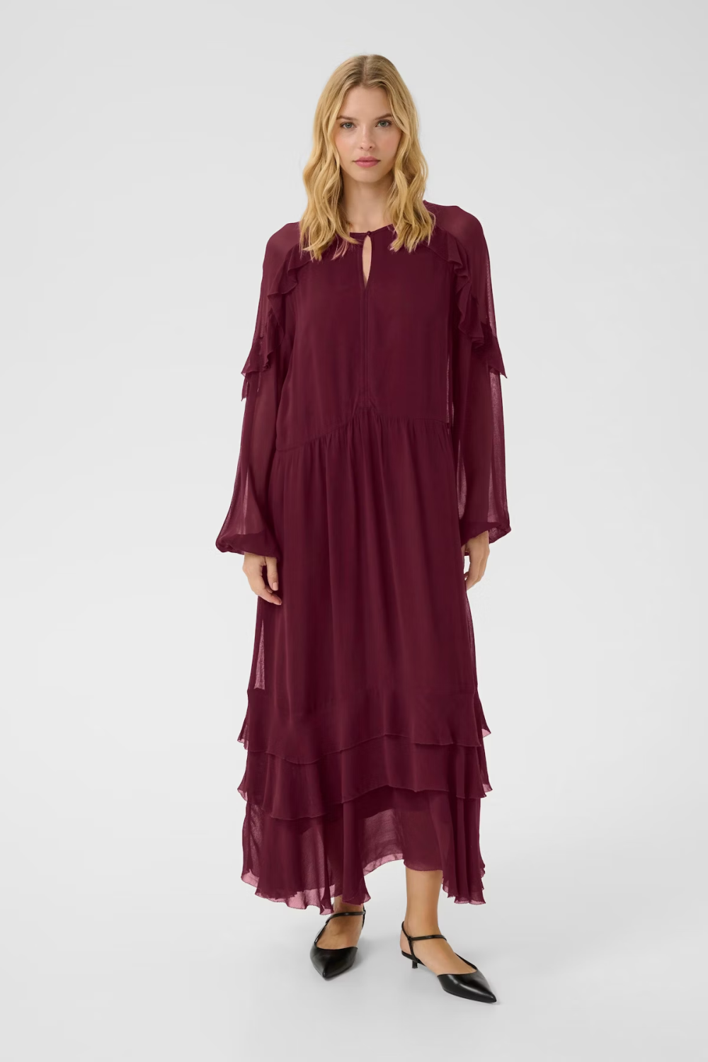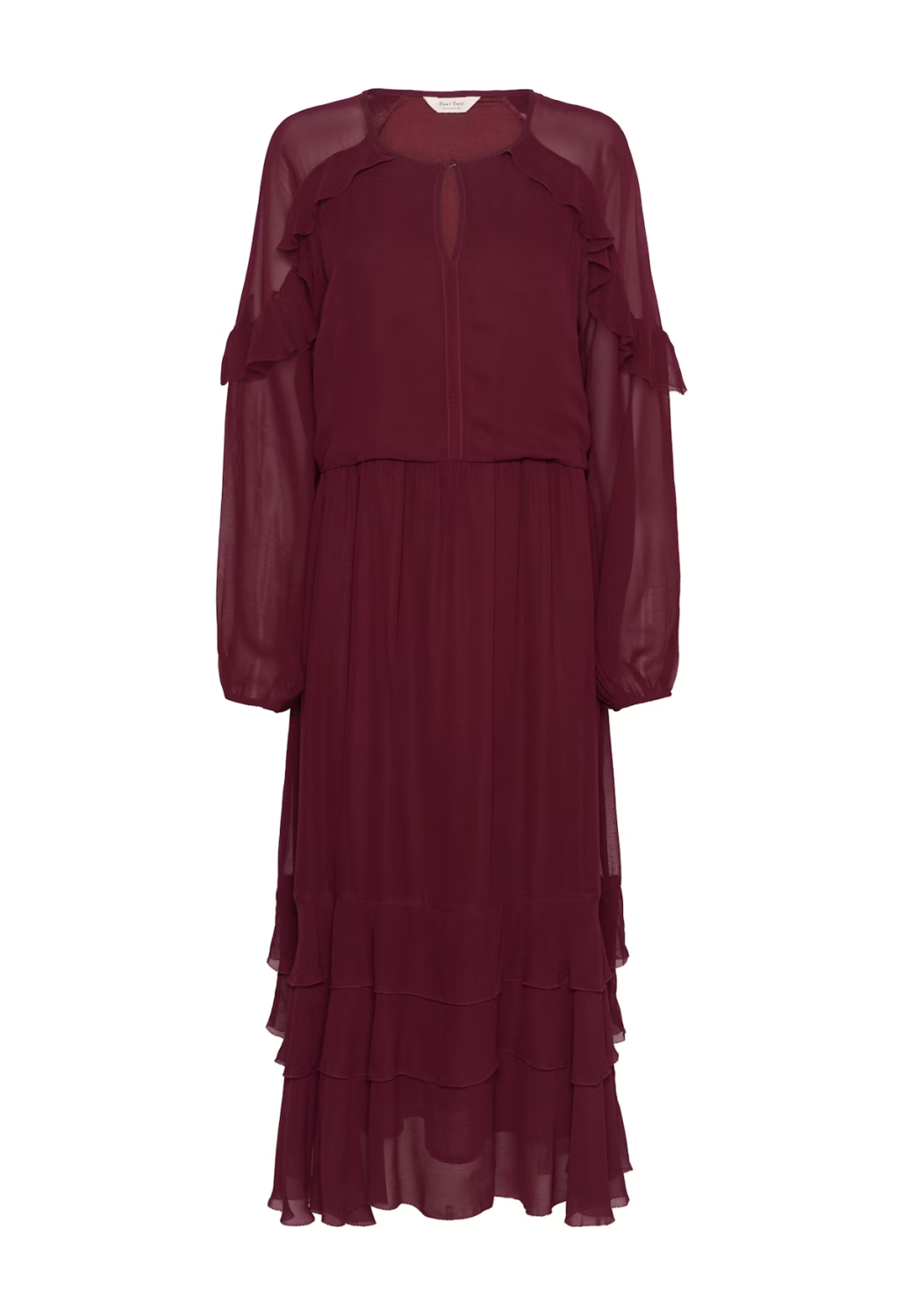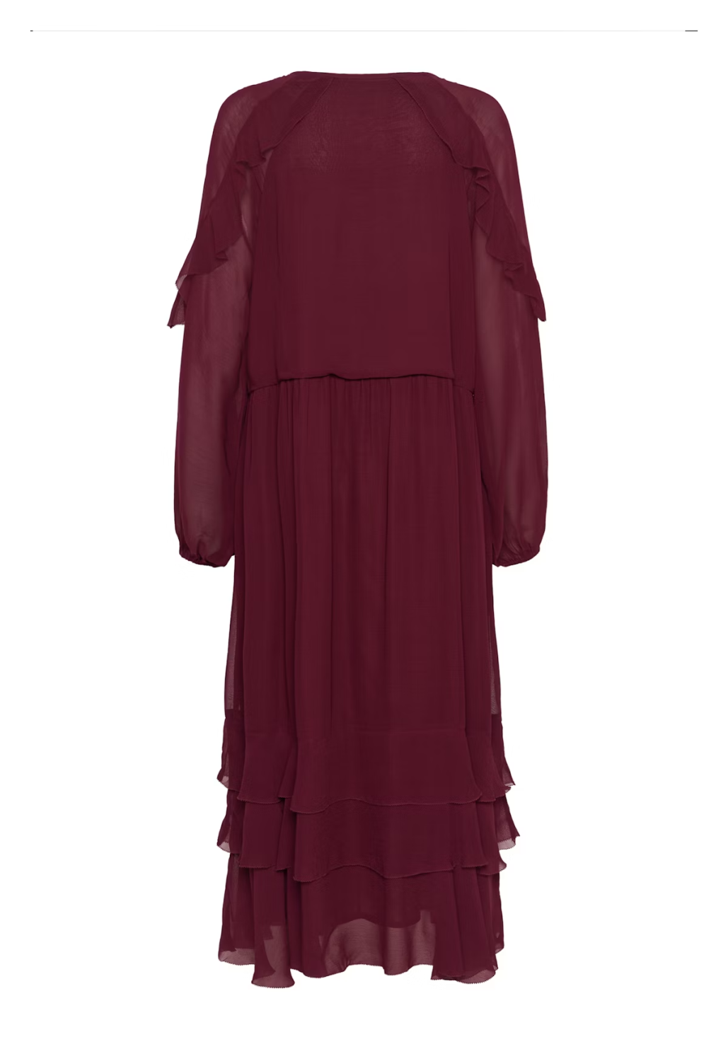 Denne lange kjolen i burgunder chiffon har et elegant fall med lagvise volanger nederst og diskrete detaljer ved skuldrene. Det lette materialet og de transparente ermene gir et luftig uttrykk – perfekt for spesielle anledninger og stemningsfulle kvelder.