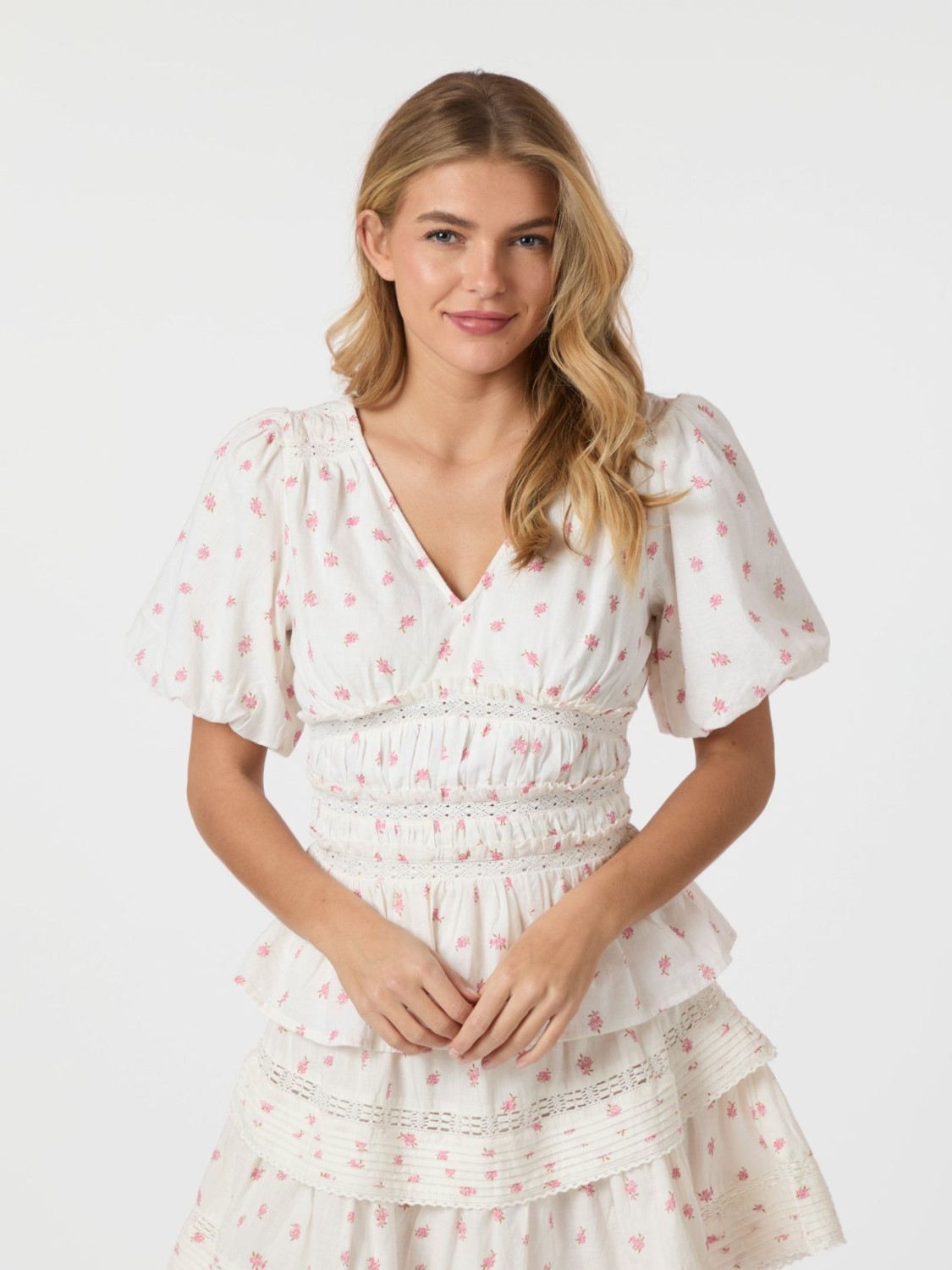 Søt bluse med korte ermer i blomstermønster og V-hals.