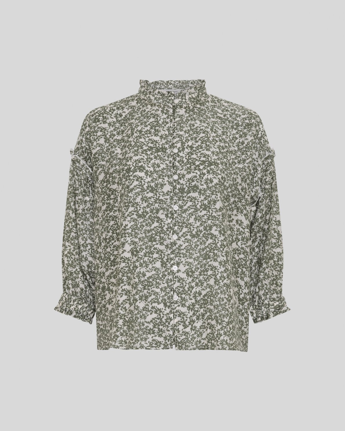 Skjorte i lett, vevd kvalitet med heldekkende blomstertrykk. Designet med høy krage med diskret volangkant, heldekkende knappelukking og 3/4-lange ermer med elastiske volangmansjetter.