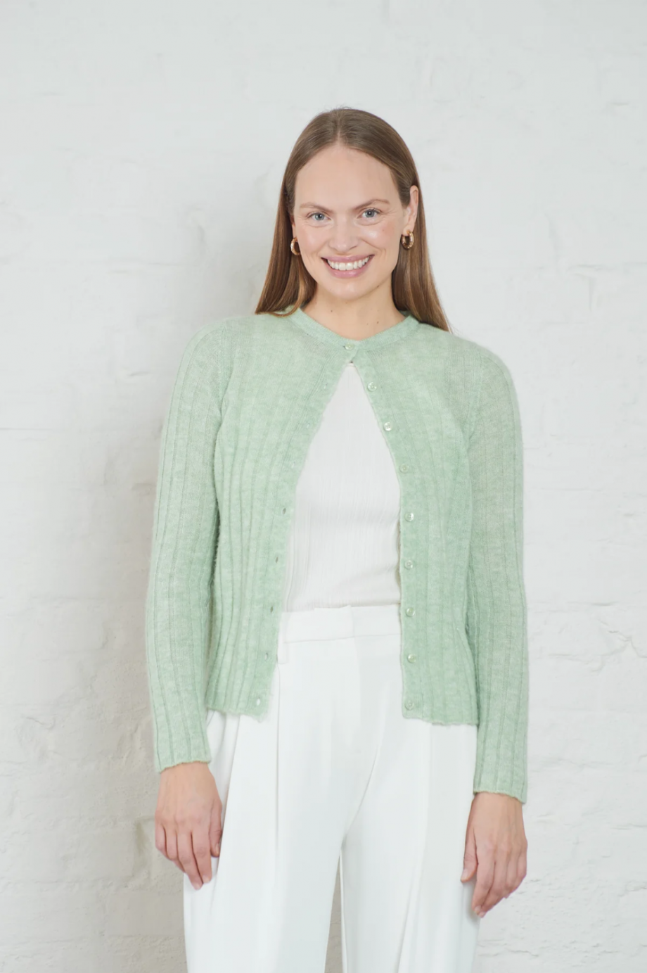 En lettstrikket cardigan med delikate, nyanserte knapper og bred ribbestrikk som gir en elegant finish. Modellen har rund hals, en kort lengde og et tidløst design som passer til enhver anledning. Like fin til jeans som over en kjole.