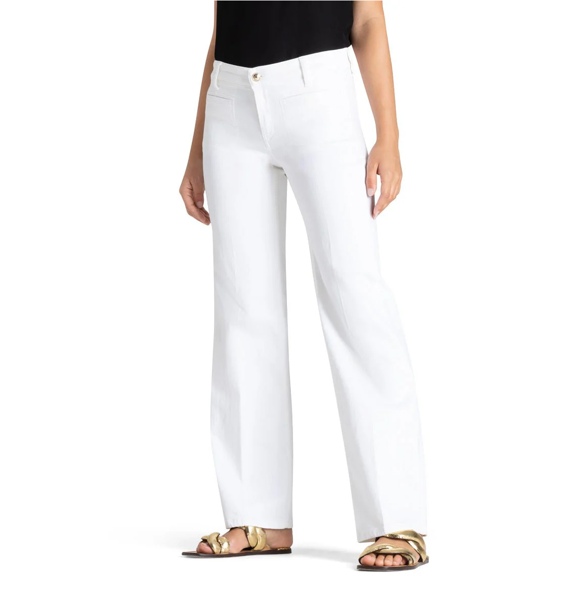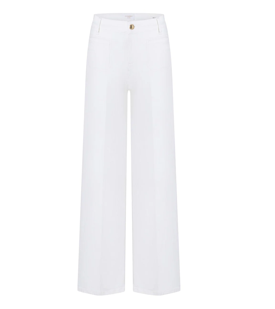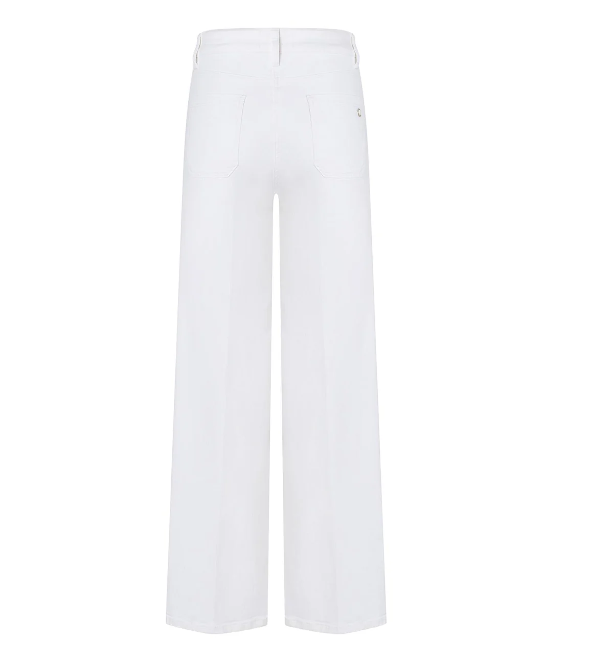 Fin hvit jeans med middels høyde på livet og vide ben med svak sleng. To små lommer i front, baklommer og brede beltehemper. Lukkes med gullknapp og glidelås i front.