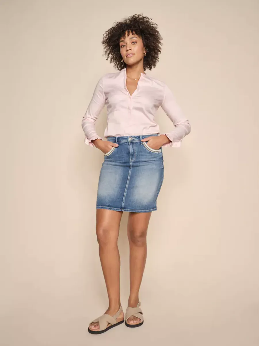 Et denimskjørt laget av bomull og designet i en flatterende slank silhuett. Den er dekorert med broderi og paljetter på frontlommene og vevd med mye stretch for å holde formen. Bruk sammen med joggesko og en logo-t-skjorte for et friskt utseende.