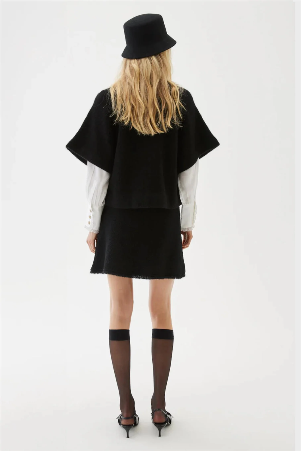 En feminin og elegant cardigan med løs passform, korte raglanermer og en ribbestrikket, høy hals. Den har tre dekorative B-knapper og et fint hulmønster ved skuldrene.