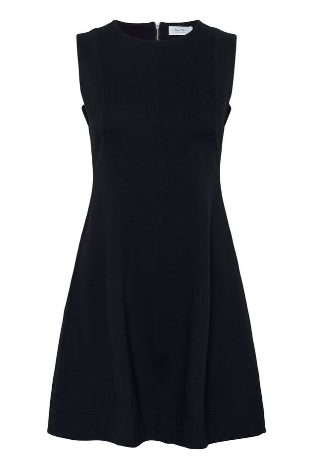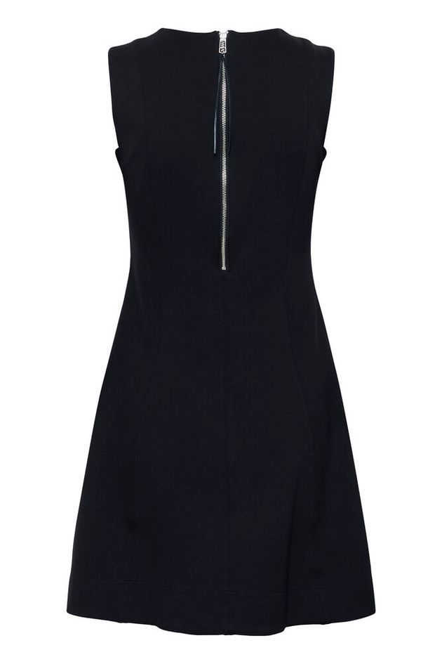 Kul , ermeløs kjole med dekorativ glidelås bak.