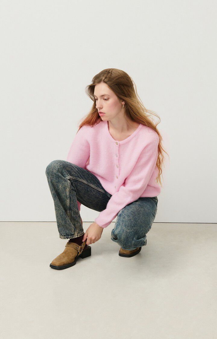 Vitow er en myk og god strikket cardigan med lange, avsmalende ermer, lav skuldersøm og en avslappet, litt cropped passform. Genseren har en rund hals og lukkes med delikate knapper. Kommer i en deilig babyrosa farge.