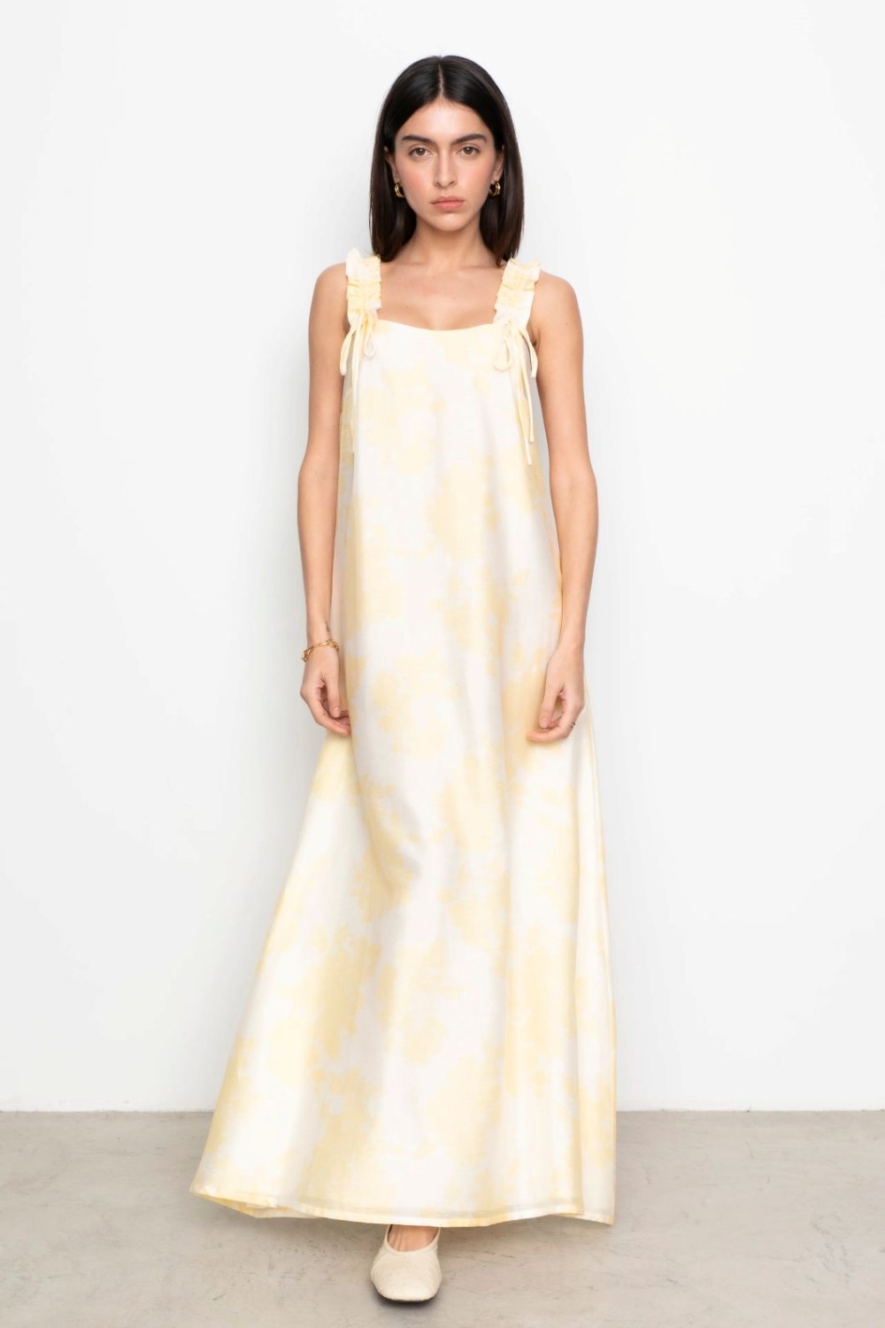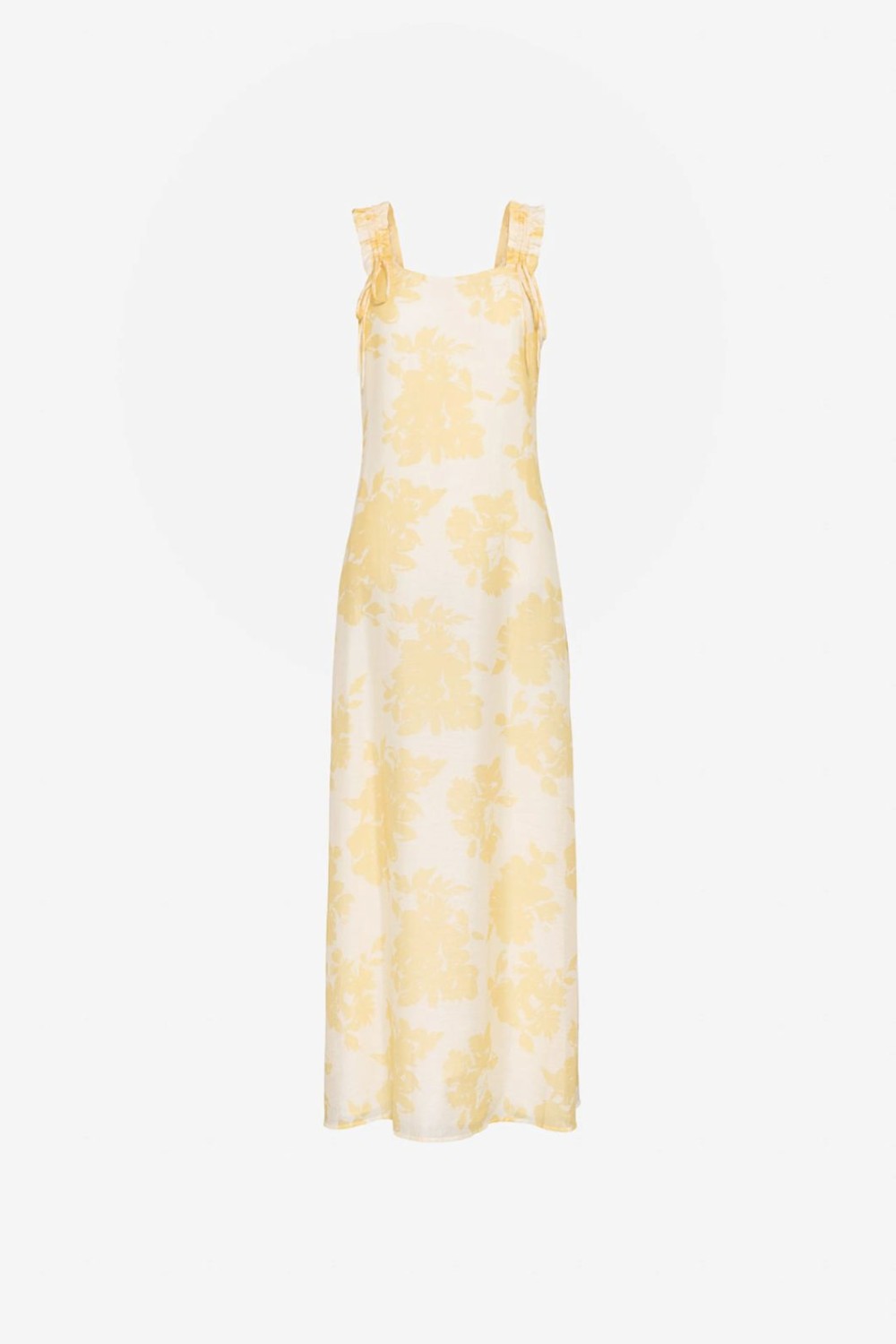 Denne nydelige kjolen er laget av en myk tencelblanding og har justerbare skulderstropper og et A-formet skjørt. Den har et delikat gult blomstertrykk og gir en lett og feminin silhuett som er perfekt for sesongen.