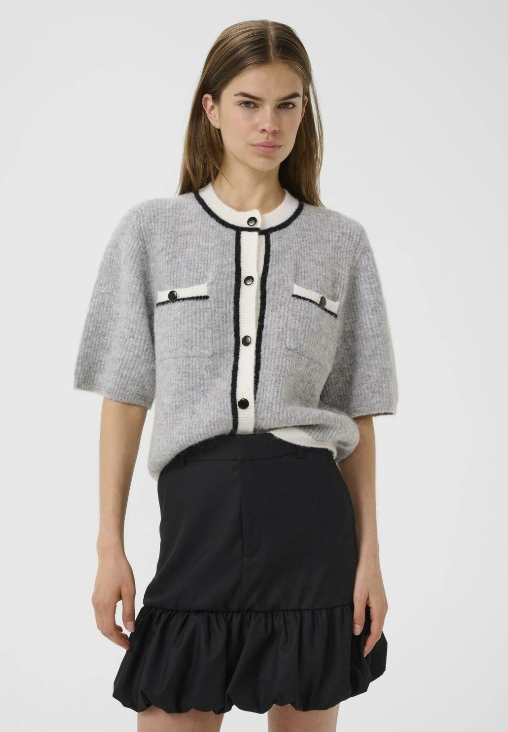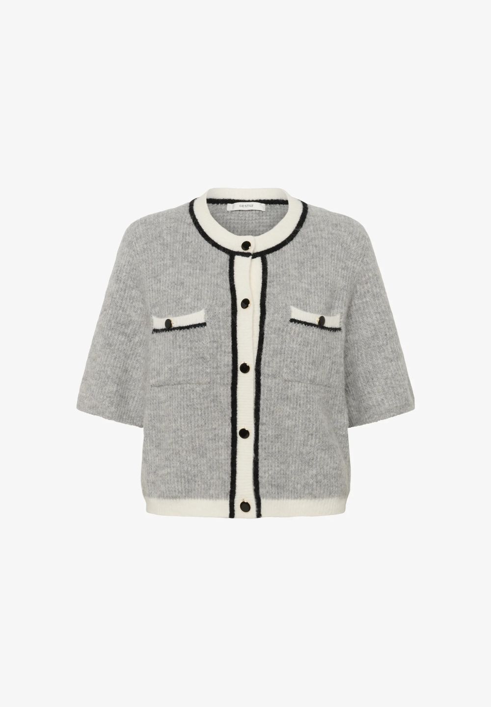 Denne cardiganen er ideell for både hverdag og fest. Jakken har korte ermer, rund hals og knapper ned i front. Kontrast farger med hvit og sort.