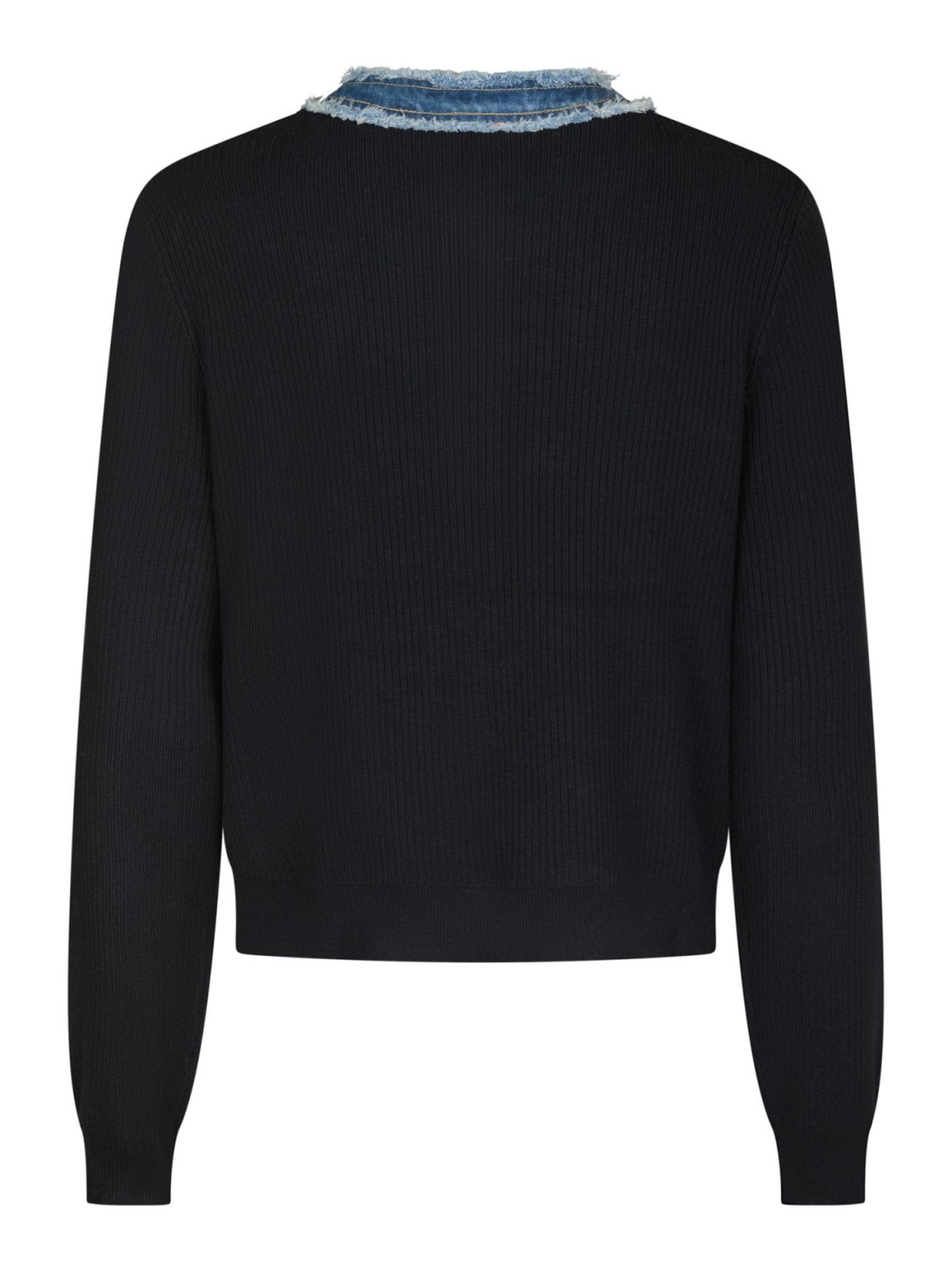 Strikket cardigan med knapper foran og rå denimdetaljer langs plaggkanten og halsen. Cardiganen har lommer foran. Modellen er 176 cm høy og bruker størrelse 36.